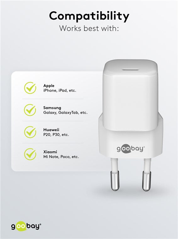 - Con una potenza di 20W, il caricatore è particolarmente adatto a dispositivi piccoli come smartphone, cuffie Bluetooth, tablet o power bank
