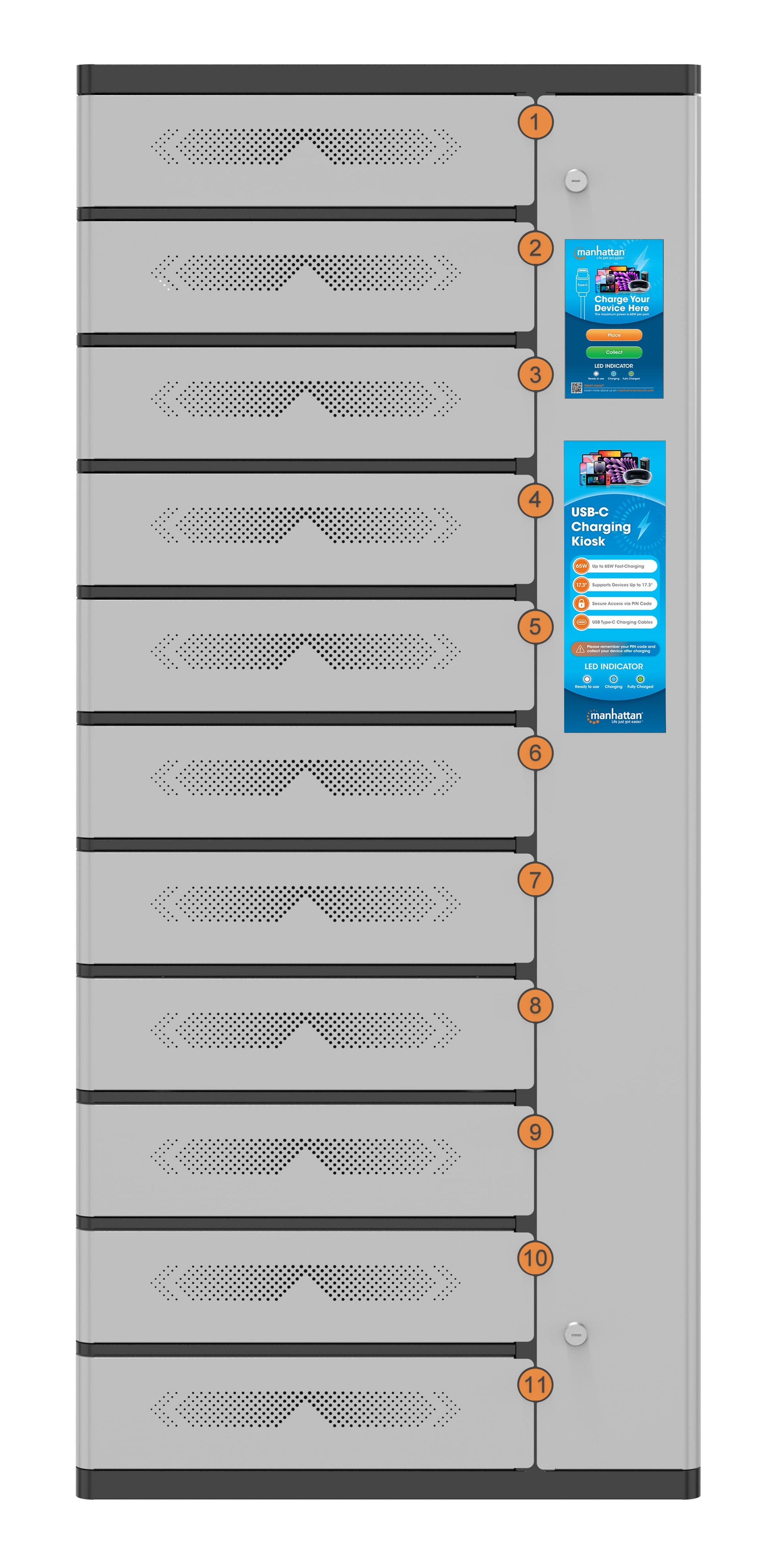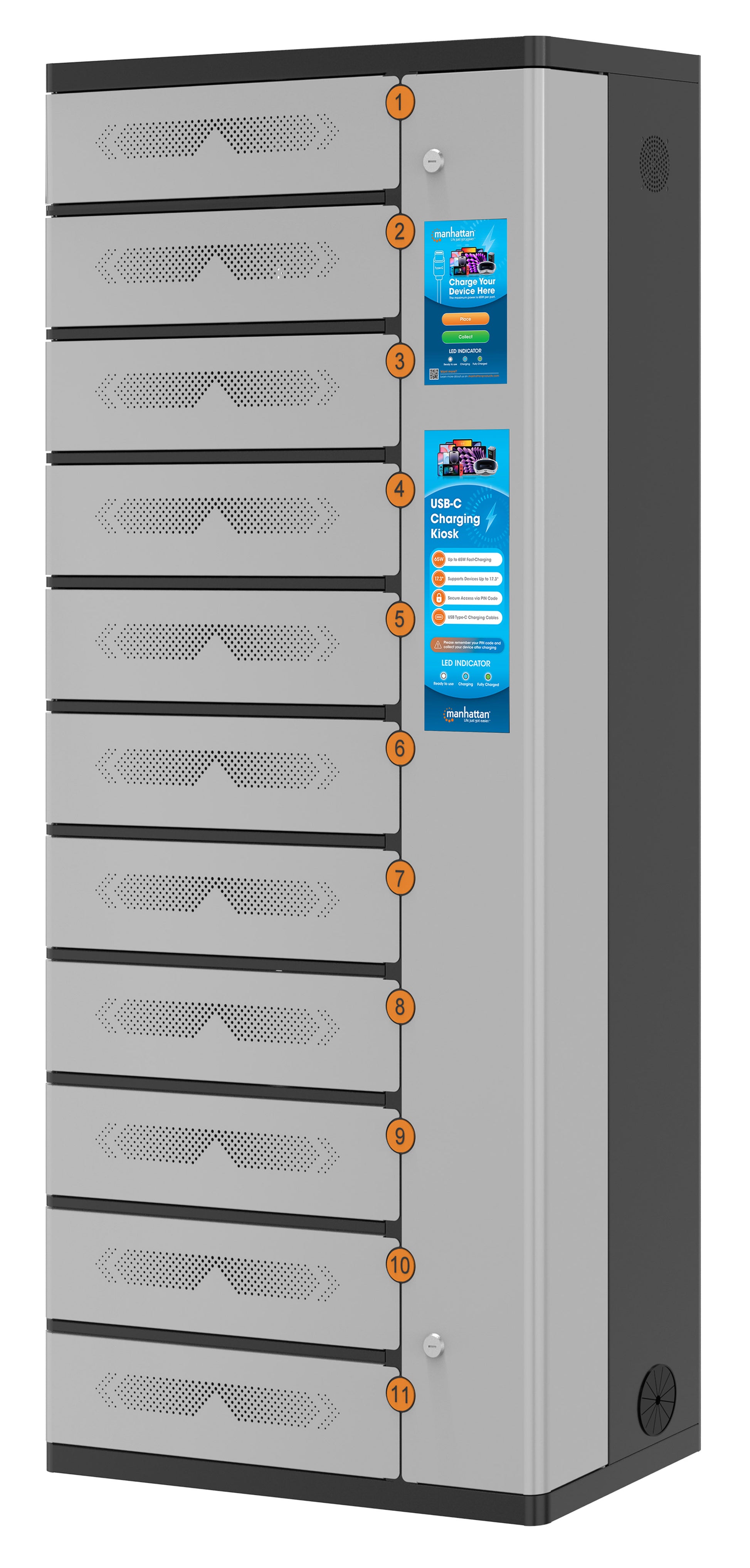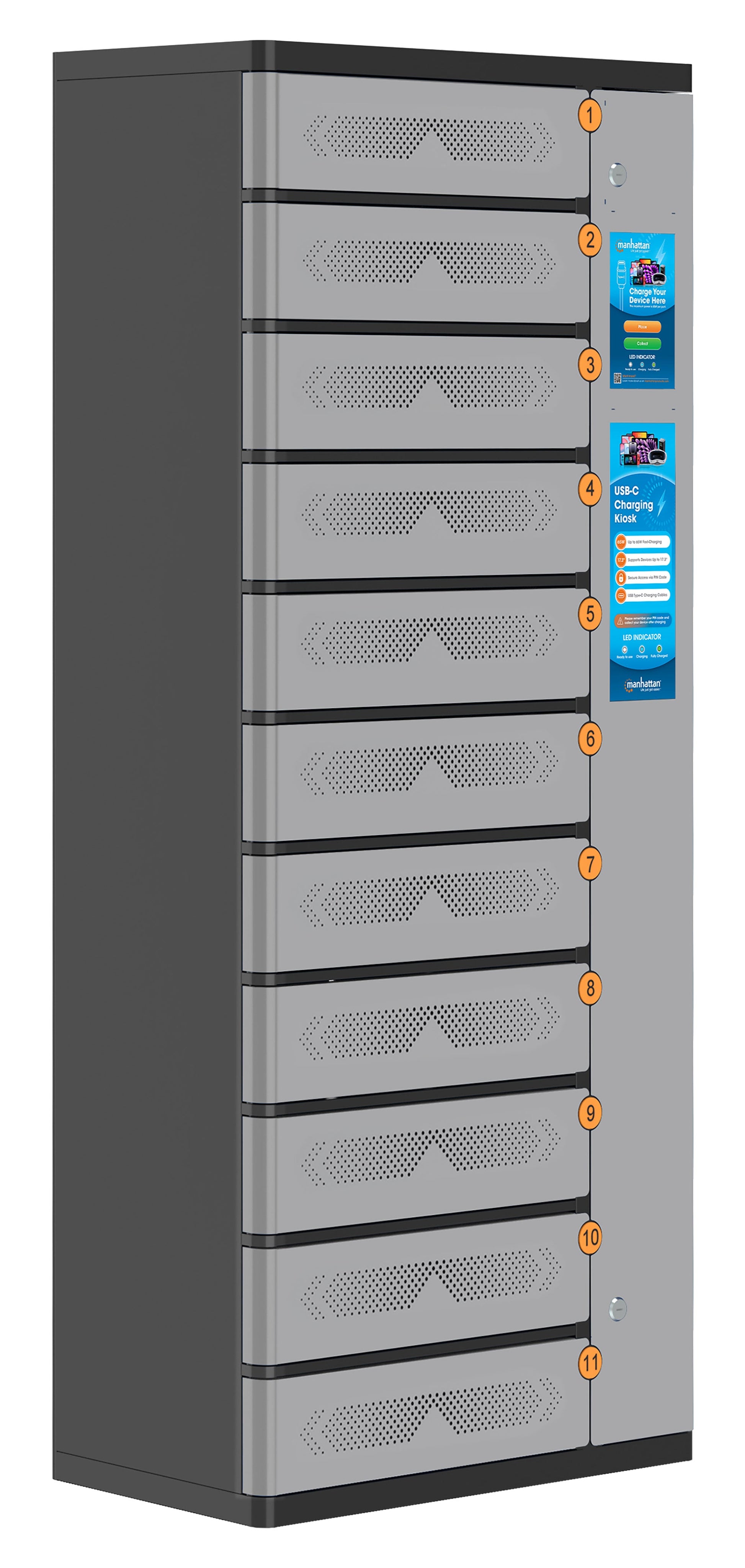 - Inclusi undici cavi USB-C™ Power Delivery per ricarica rapida con fino a 65 W per scomparto; non sono richiesti adattatori AC o caricatori da muro