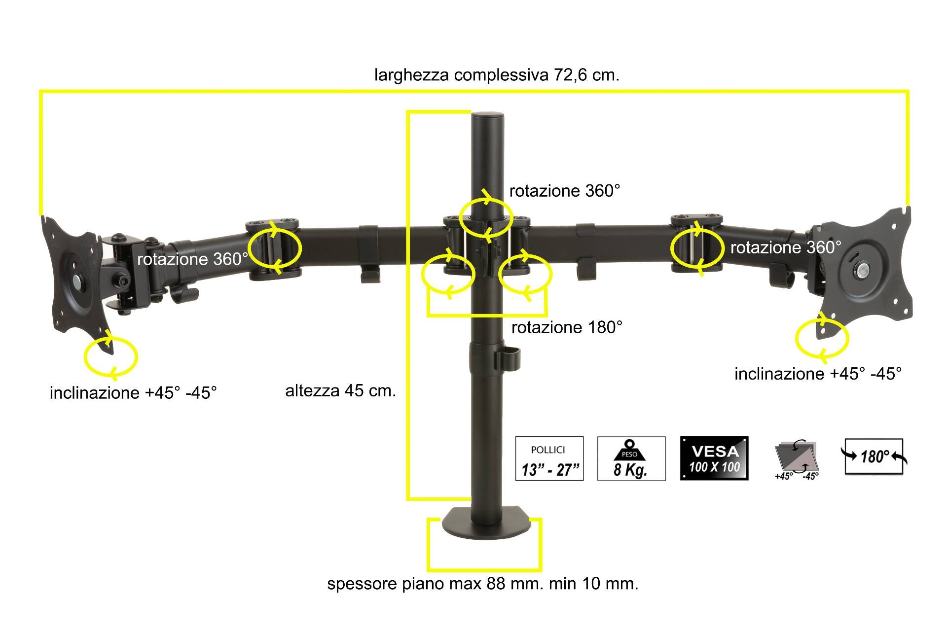 Staffa supporto da tavolo con ganascia, permette di liberare spazio sulla scrivania, appendendo i monitor alla staffaSupporta video da 13 a 27'' fino a 8 kg di peso per ogni braccio Si può muovere in ogni direzione permettendo la massima flessibilità, grazie ai 3 snodi presenti su ogni braccioPuò ruotare di 360°, per supportare la modalità panorama durante la visione, permette di regolare l'inclinazione e della rotazione del monitorSi può quindi regolare l'angolo di visione a seconda delle esigenzeSi può regolare l'altezza verticale del monitor fino all'altezza desiderata E' un'ottima soluzione per l'esigenza di un supporto con fissaggio al tavolo di un monitorPer organizzare i cavi lungo l'asta ci sono delle clip appositeIn acciaio, molto robusto Dimensione prodotto: 726X550X116mm Supporta monitor standard VESA: 100x100 e 75x75 Inclinazione verticale: +45° -45° Regolazione orizzontale: 180° Rotazione: 360° Altezza: 450mm Per tavoli di spessore: 10mm-88mm Manuale in italiano