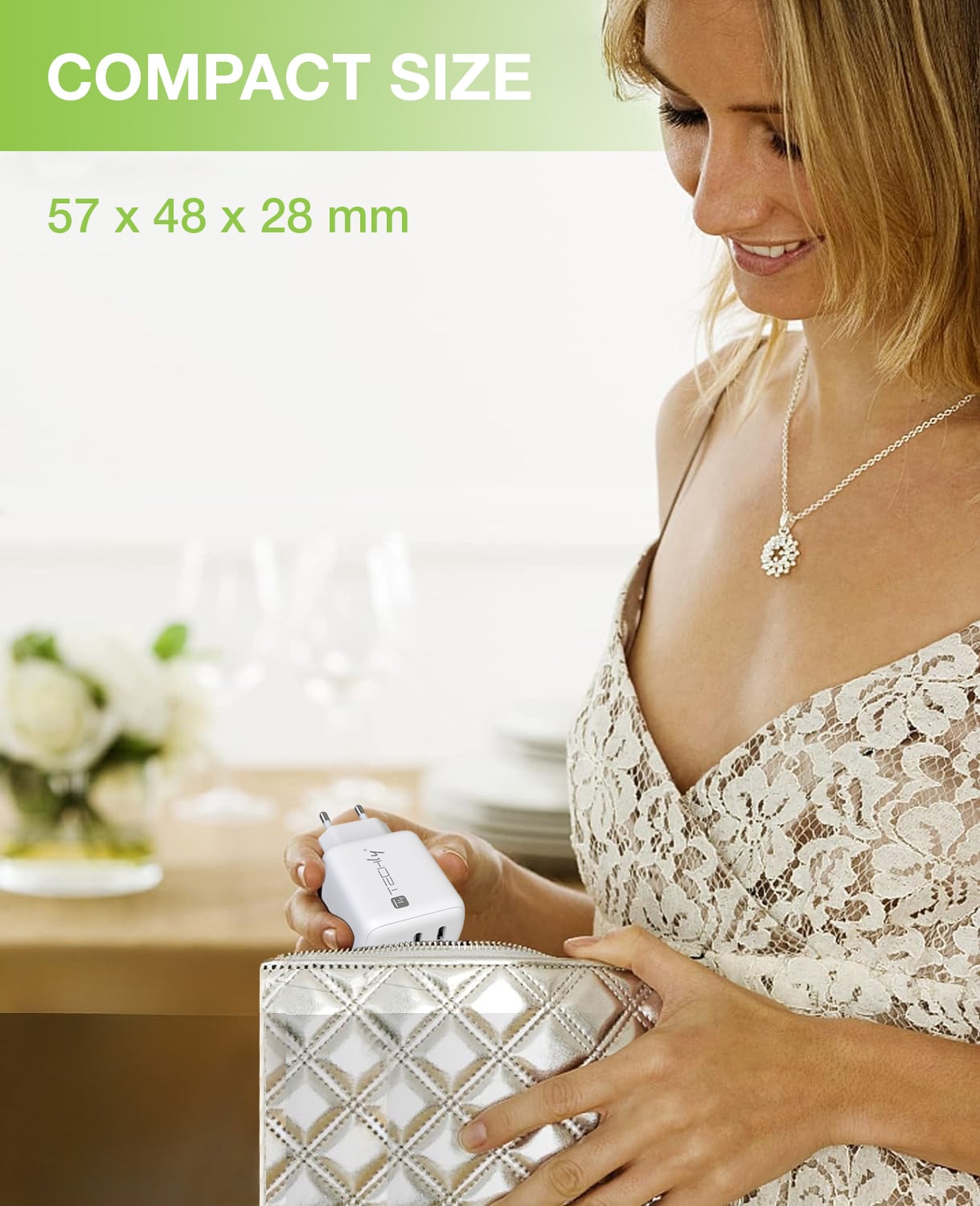 - Caricatore da parete con due porte USB-C™ per ricaricare due dispositivi rapidamente