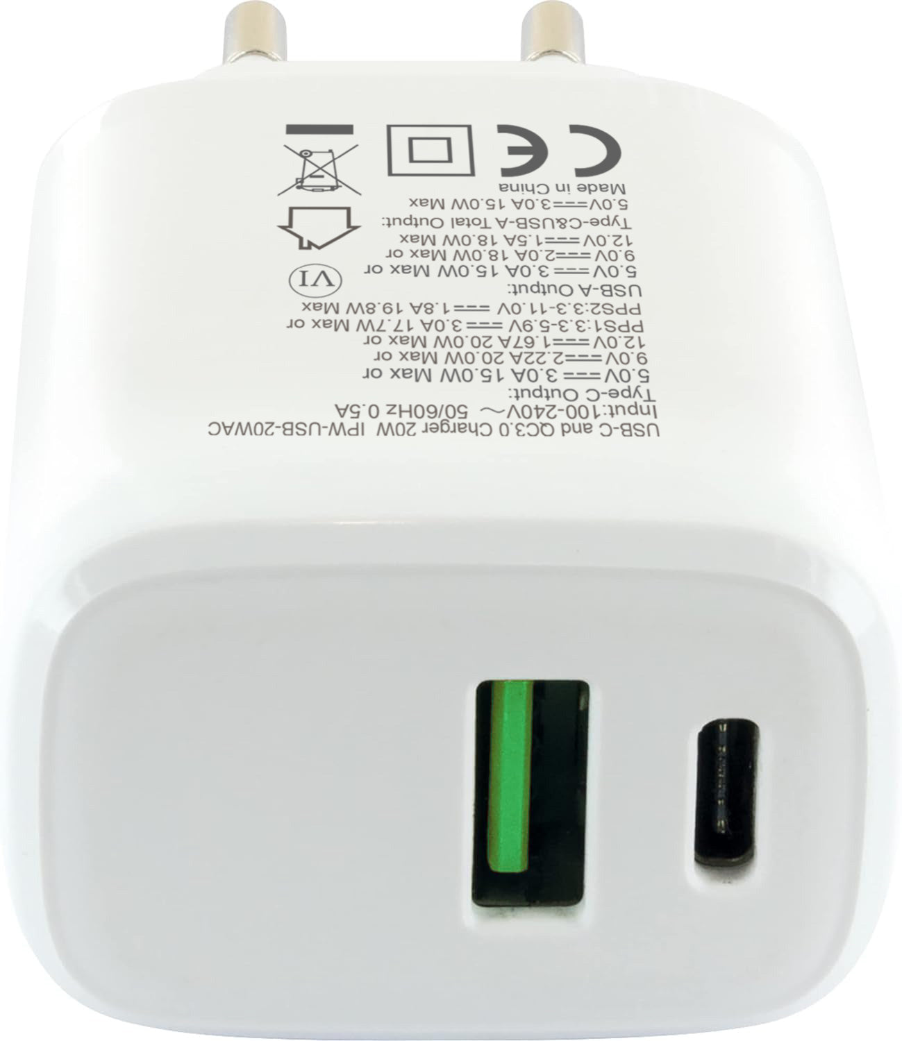 IPW-USB-20WACG é un caricabatterie rapido da viaggio ultracompatto e potente con una porta USB Type-C™ e una porta USB-A per la ricarica rapida di tutti i dispositivi compatibili.