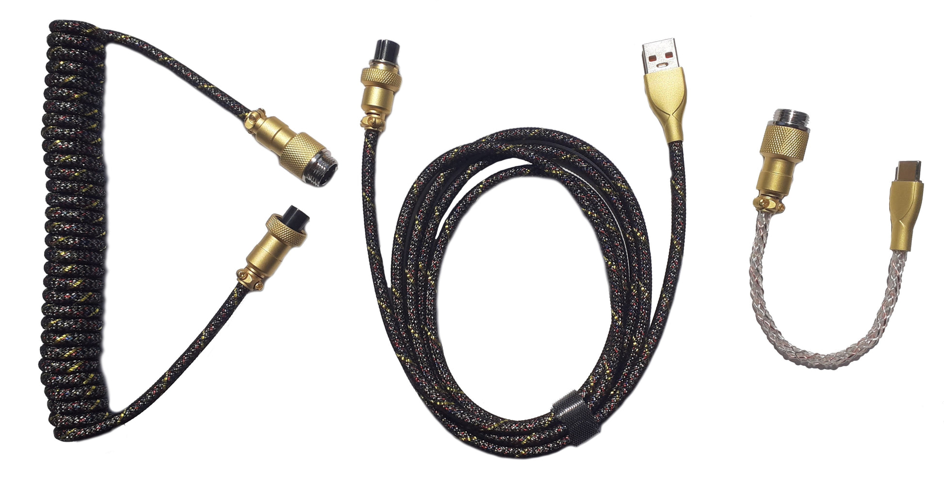 Coppia cavi Aviator USB di alta qualita' per tastiera.Si possono collegare da soli, sono particolarmente utili nel caso di installazioni dove si colleano e scollegano i cavi frequentemente, diminuendo in questo modo l'usura sui connettori USB.In due parti, una dritta e una arrotolata, con connettore stile aviazione e con interno in 4 core di rame assicura una comunicazione perfetta e una ricarica rapida (supporta ricarica rapida da 20w).Collegati tra loro, diventano un normale cavo USB-C - USB A.Disponibile in varie colorazioni anche abbinabili alle nuovissime tastiere Gasket Cortek.Aviator cable USB 2.0 da tipo A a tipo C 24AWG.Cavo 1: connettore USB A - Connettore Aviator 4 poli femminaCavo 1: connettore USB-C - Connettore Aviator 4 poli maschioFunctioni: Ricarica rapida da 20W e trasferimento dati, collegamento tastiere gaming con connettore USB-CVoltage 5V/2AConduttori in rame a 4 conduttoriLunghezza 1.80 (3.00 steso)