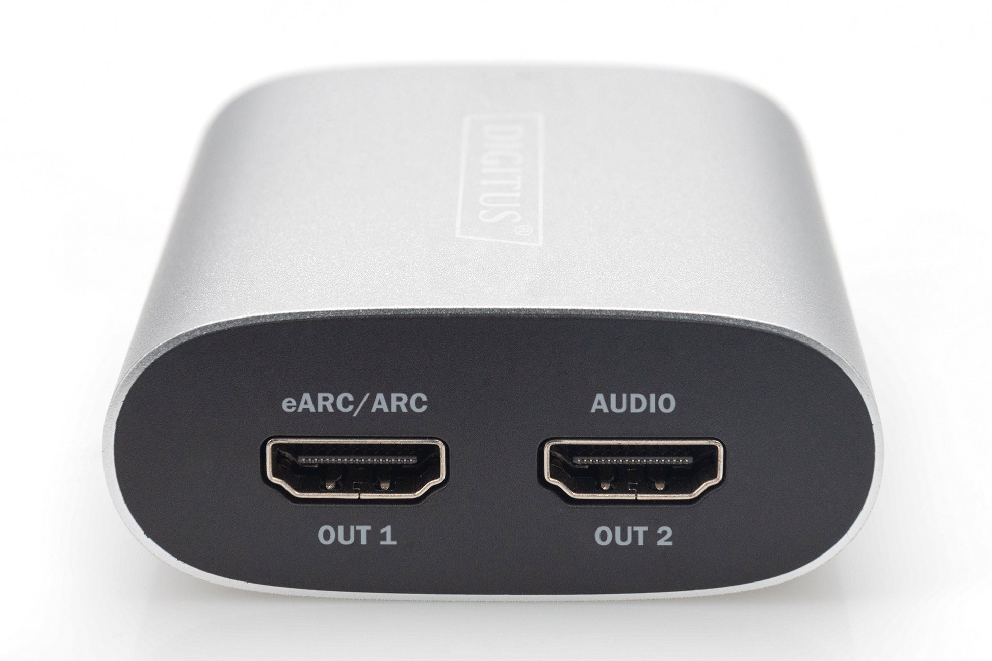 Descrizione Il convertitore/splitter DIGITUS® HDMI eARC offre 2 modalità operative: Modalità 1 -> Estrattore audio eARC - Consente di collegare un dispositivo HDMI2.1 (ad es XBox Series X, PS5) a un televisore UHD continuando a utilizzare il vecchio AVR (ricevitore audio-video)Il suono surround 5.1 / 7.1 non compresso, così come ATMOS e DTS, può essere estratto dalla porta eARC o ARC del televisore verso qualsiasi ingresso HDMI standard (NON porta eARC) del vecchio AVR o della soundbarDispositivi/stick di streaming, TV satellitare, app di streaming sulla Smart TV beneficiano del miglior contenuto audio possibile Modalità 2 -> Splitter audio - Con l’ingresso HDMI locale e l’estrazione eARC disattivata sul commutatore, è possibile suddividere il flusso audio da qualsiasi sorgente audio multicanale HDMI e inviare il video a qualsiasi televisore HDMI 2.0.L’uscita audio fornisce un'immagine nera a 720p compatibile con qualsiasi vecchio AVR con HDMI 1.3 o superioreDettagli tecnici Larghezza di banda video: 18 Gbps Supporta risoluzioni fino a UHD 4K/60Hz, 4:4:4 Commutatore EDID Supporta CEC (Consumer Electronic Control) HDMI 2.0b / HDCP 2.3 Supporta HDR, HDR10, HDR10+, Dolby Vision Pass-Through Supporta PCM 2.0, LPCM 5.1 / 7.1, Dolby Digital, Dolby Digital+, Dolby True-HD, Dolby Atmos, DTS 5.1, DTS ES 6.1, DTS HRA, DTS HD Master, DTS:X Ingressi: 1x presa HDMI, 1x MicroUSB (DC 5V/500mA) Uscite: 2x prese HDMI 1x commutatore eARC (On/Off) 1x commutatore EDID/uscite (1/2) 1x LED di stato Alloggiamento in alluminio Protezione ESD Temperatura operativa: 0 - 40° Colore: Argento