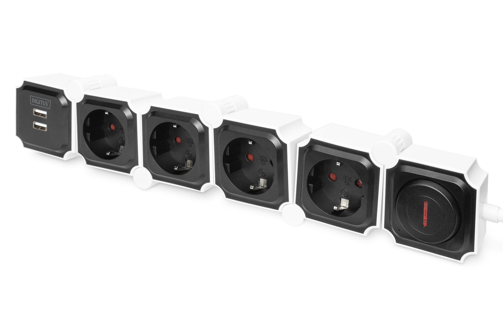 Grazie alla presa multipla flessibile di DIGITUS® è possibile orientare ogni singola presa in base alle proprie preferenze e all’ambiente nonché adeguarla ai diversi tipi di spina.Ciascun dispositivo è dotato di spine o alimentatori di dimensioni diverse, una circostanza che spesso può rappresentare un problema di spazio per le normali prese multiple.Gli elementi di questa presa multipla flessibile possono essere orientati di fino a 180° dando agli alimentatori sporgenti o spine ad angolo ingombranti tutto lo spazio che gli occorre.In aggiunta, questa presa multipla può essere applicata sugli spigoli o gli angoli del posto di lavoro, adeguandosi pertanto perfettamente al proprio ambiente.Inoltre sono integrate due porte USB per ricaricare smartphone o tablet con spina USB A.L’interruttore on/off può essere usato anche a pedale, ad esempio se viene collocato sotto alla scrivania.La presa multipla può essere orientata in tutte le forme possibili immaginabili, consentendo pertanto massima flessibilità.Dettagli tecnici Tensione di ingresso: 230 VAC, 16 A, 50 Hz Potenza di uscita: 3.680 W, 16 A Potenza USB: 5V, 2,4 A (totale) Numero degli elementi mobili: 6 Prese munite di messa a terra: Protezione da contatto: le coperture in plastica coprono i contatti della presa 4x Sicurezza bambini: le coperture in plastica coprono i contatti della presa Interruttore on/off, indicazione di funzionamento illuminata Dimensioni dei singoli moduli: (Lungh x Largh x Alt) 6 x 6 x 4 cm (senza cerniera) Cavo di alimentazione con spina munita di messa a terra, angolo di 90°: 1,6 m Peso: 660 g Colore: bianco / nero Stile: Presa multipla
