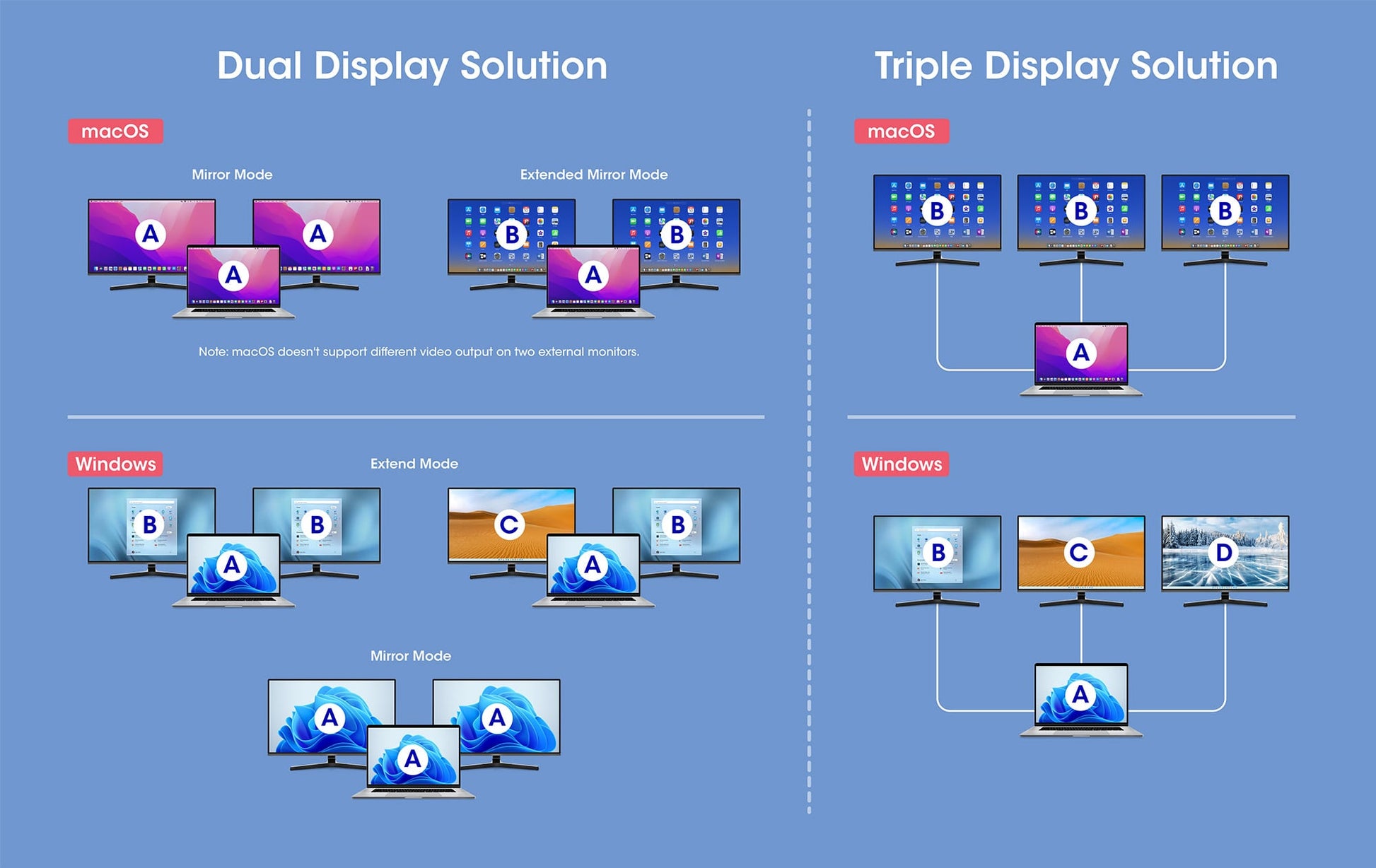 - Usa Multi-Stream Transport (MST) per modalità di visualizzazione su Windows® (Mirror o Fully Extended) e Mac® (Mirror o solo Extended Mirror)