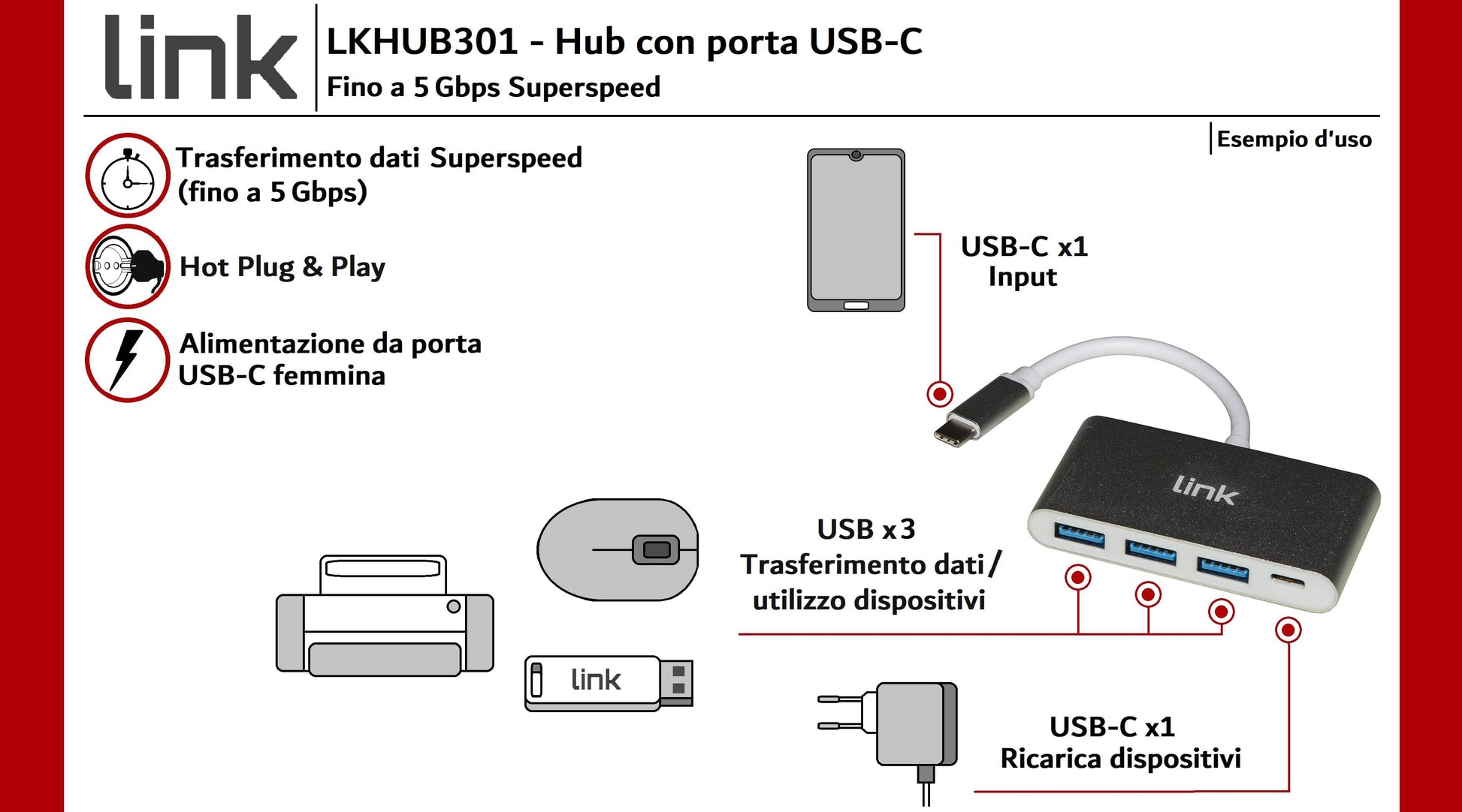 Hub per smartphone, tablet o notebook con porta USB-C® maschio, 3 porte USB 3.0/USB3.1 (GEN 1) 5 Gbps femmina, e porta USB Type C® femmina per ricaricare i dispositivi. Collegando questo HUB per esempio alla porta USB-C di un notebook, si possono avere altre 3 porte USB 3.0 per collegare altri dispositivi come tastiere, mouse, memorie USB, stampanti, e un’altra porta USB-C. Le porte USB 3.0 sono fino a 10 volte più veloci rispetto allo standard USB 2.0, permettendo una grande rapidità di scambio dati.Connettori: 1 connettore USB-C maschio Input 3 connettori USB 3.0 tipo A femmina output