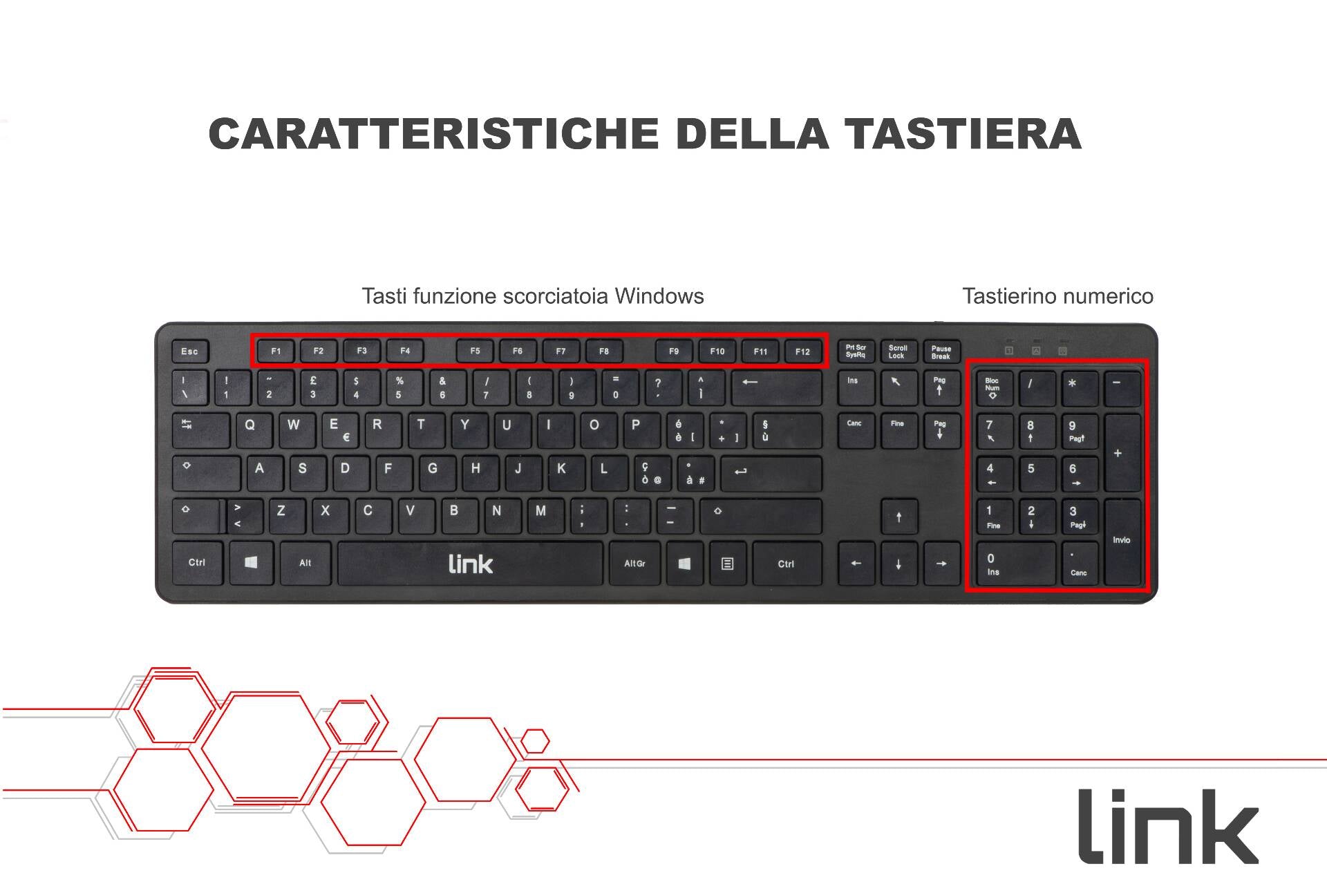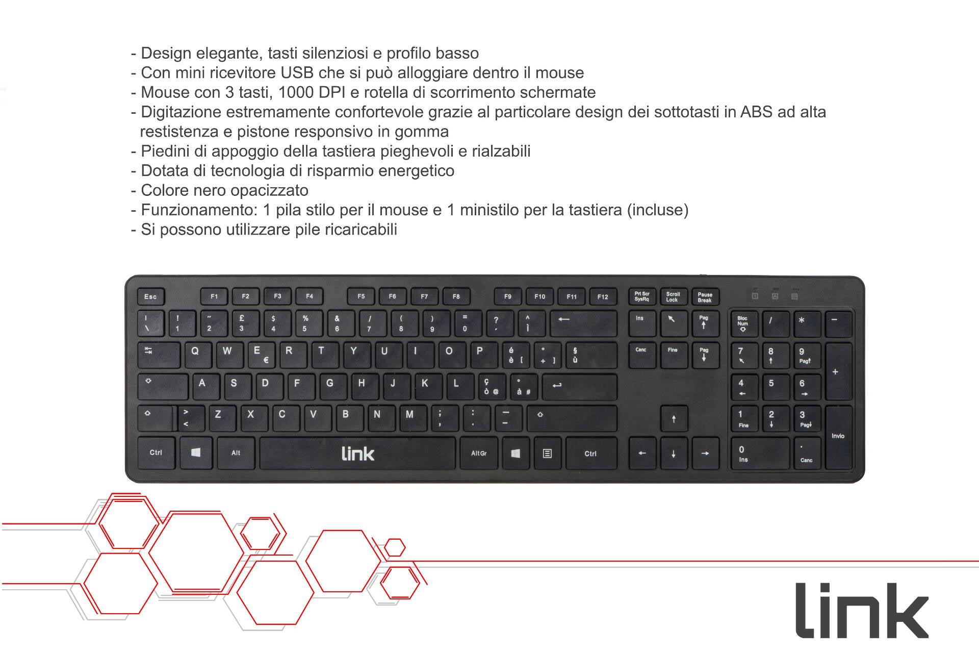Kit combo con Tastiera wireless con schema tasti italiano e mouse wireless.Con lo stesso ricevitore si collega a una porta USB sia il mouse sia la tastiera a un PC o notebook. Design elegante, tasti silenziosi, profilo basso, tastiera numerica di dimensioni standard.Con mini ricevitore USB che si può alloggiare dentro il mouse. Mouse con 3 tasti, 1000 DPI e rotella di scorrimento schermate.Digitazione confortevole grazie al particolare design dei sottotasti in ABS ad alta resistenza e pistone responsivo in gomma.Piedini di appoggio della tastiera pieghevoli e rialzabili.È sufficiente collegare il ricevitore nella porta USB a un PC desktop o a un notebook ed è tutto pronto per l'utilizzo.Collegamento: Sensore wireless USB con portata di 10 metri e frequenza 2,4 Ghz.Con tecnologia di risparmio energetico.Colore nero opacizzato.Funzionamento: 1 pila stilo per il mouse e 1 ministilo per la tastiera (incluse).Si possono utilizzare anche batterie ricaricabili.
