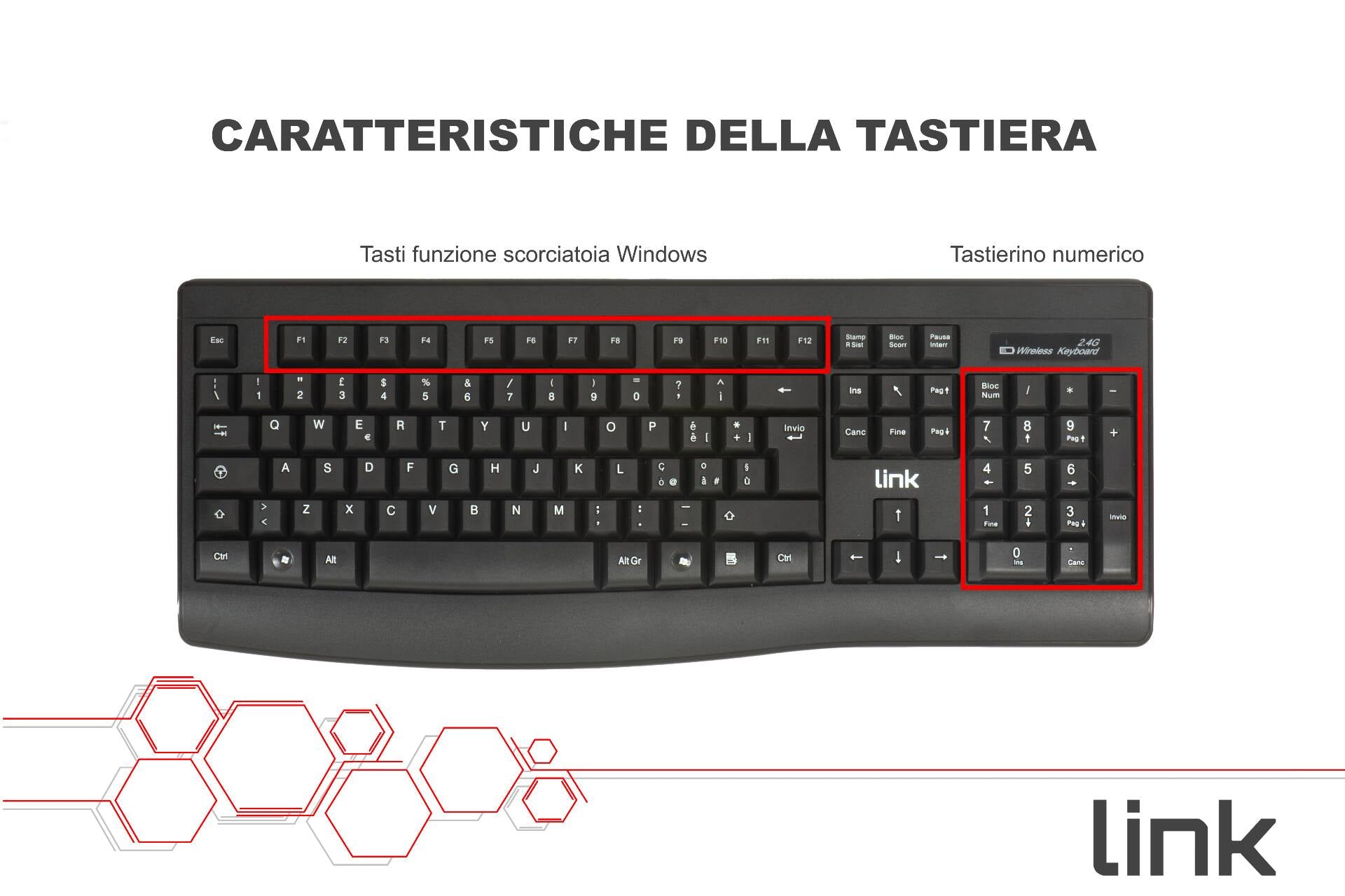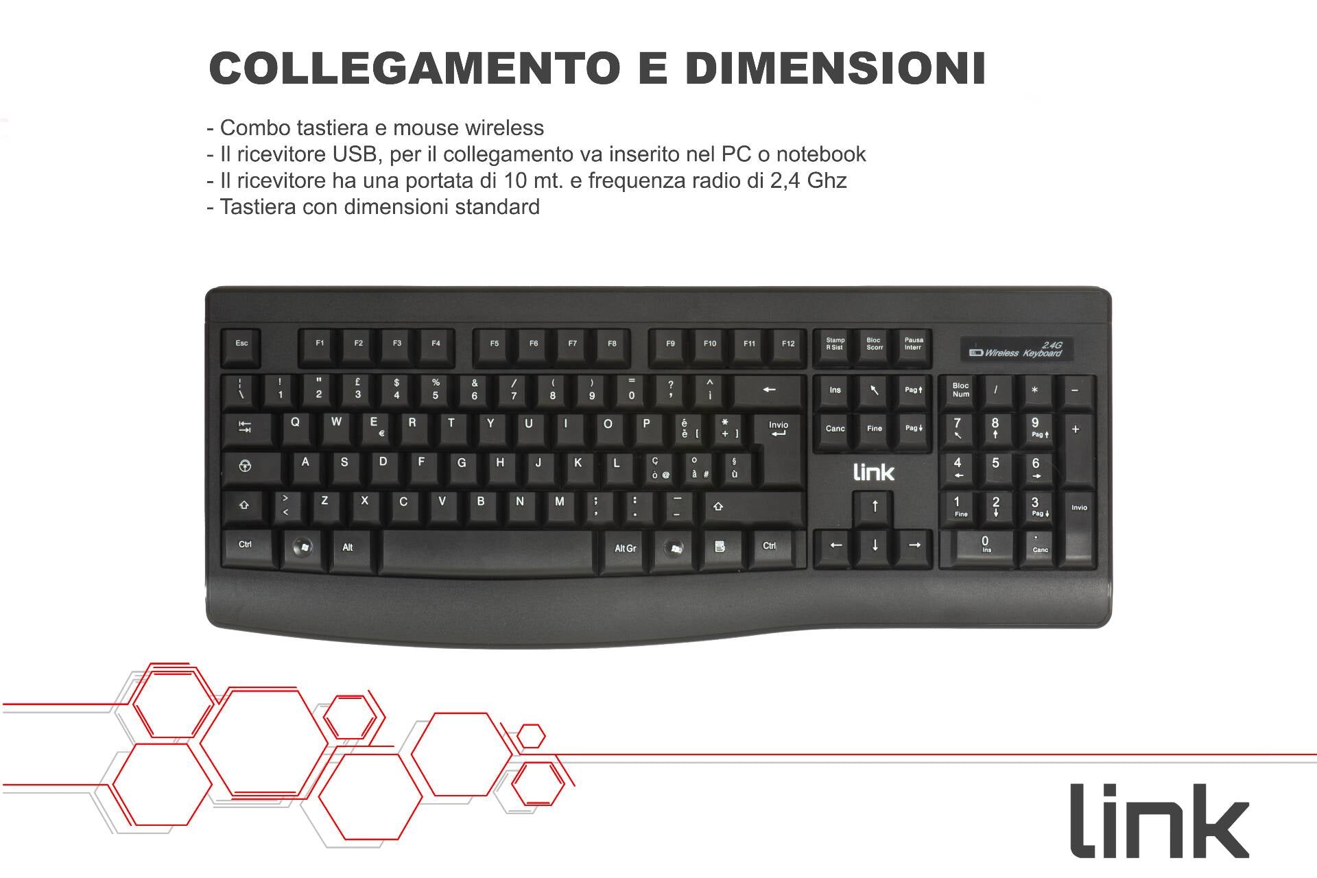 Kit combo con Tastiera wireless con schema tasti italiano e mouse wireless.Mini ricevitore USB che si può alloggiare dentro il mouse Digitazione confortevole grazie al particolare design dei sottotasti in ABS ad alta resistenza e pistone responsivo in gomma.Piedini di appoggio della tastiera pieghevoli e rialzabili.Design elegante, tasti silenziosi, profilo basso, tastiera numerica di dimensioni standard.Ê sufficiente collegare il ricevitore nella porta USB a un PC desktop o a un notebook ed è tutto pronto per l'utilizzo.Colore nero opacizzato.Con tecnologia di risparmio energetico.Mouse con 3 tasti, 1000 DPI e rotella di scorrimento schermate.Il ricevitore ha una portata di 10 metri e una frequenza radio 2,4 Ghz.Funzionamento con 1 pila stilo per il mouse e 1 ministilo per la tastiera (non incluse).