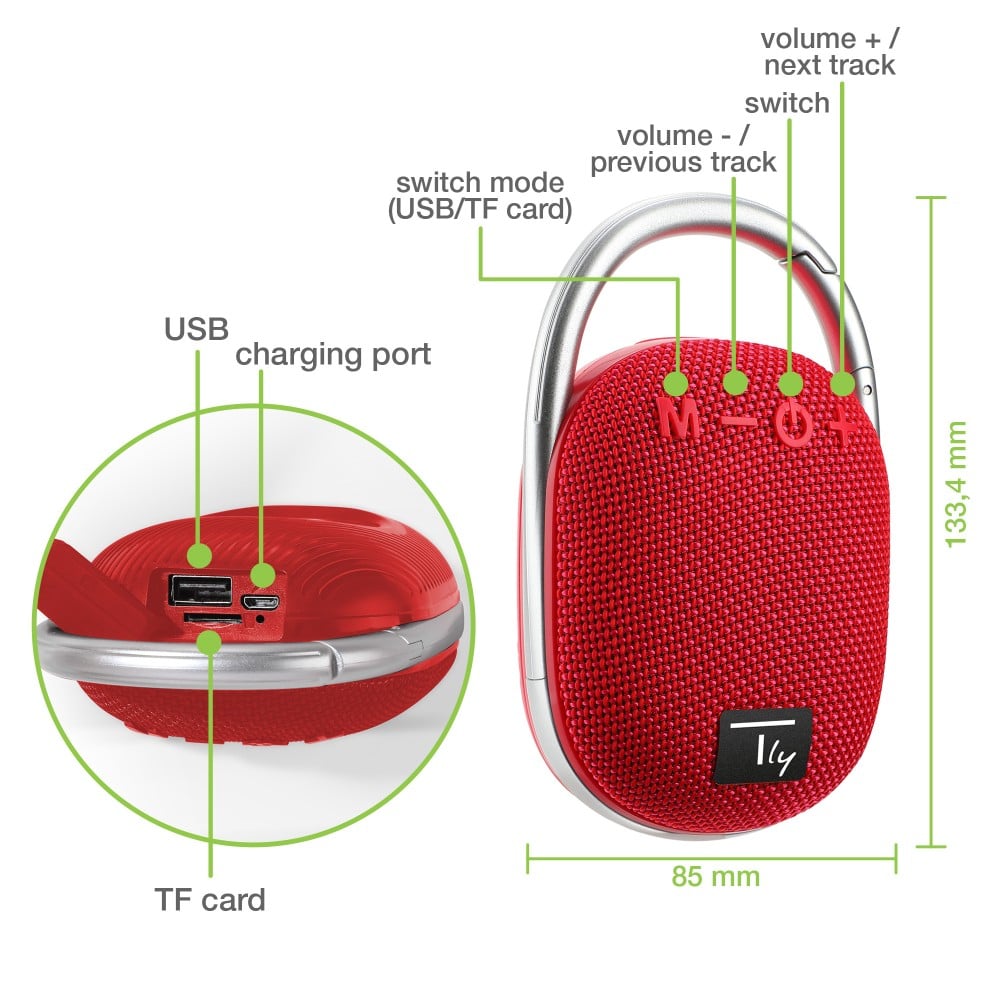- Le dimensioni compatte consentono di ascoltare la propria musica preferita ovunque si desideri e, grazie al moschettone, è possibile agganciarlo ovunque e portarlo sempre con sé