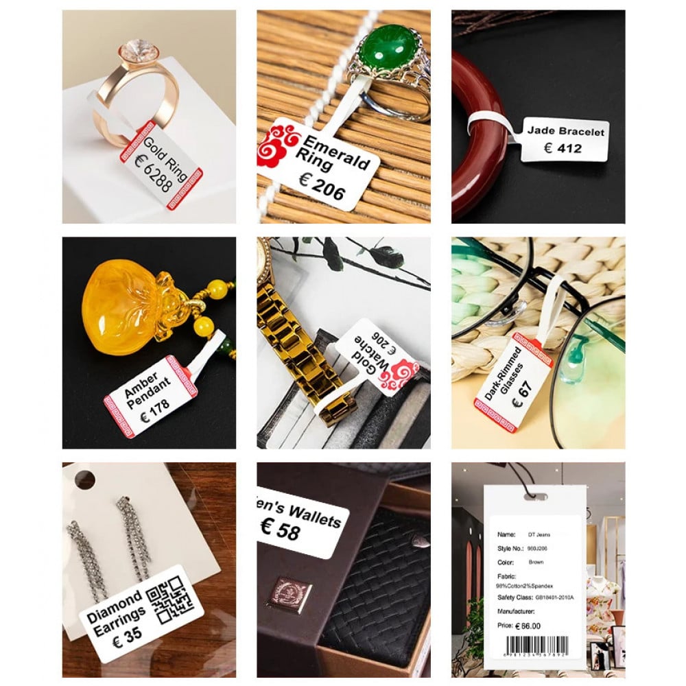 - L APP gratuita offre numerosi modelli, con cui puoi stampare facilmente qualsiasi etichetta di cui hai bisogno: etichette per abbigliamento, etichette per prezzi, etichette per cavi, etichette per gioielli, etichette per indirizzi, etichette per cartelle, etichette per alimenti, etichette con nome e così via; testo modificabile, codice a barre, logo, immagine, tabella, ora, linea, ecc