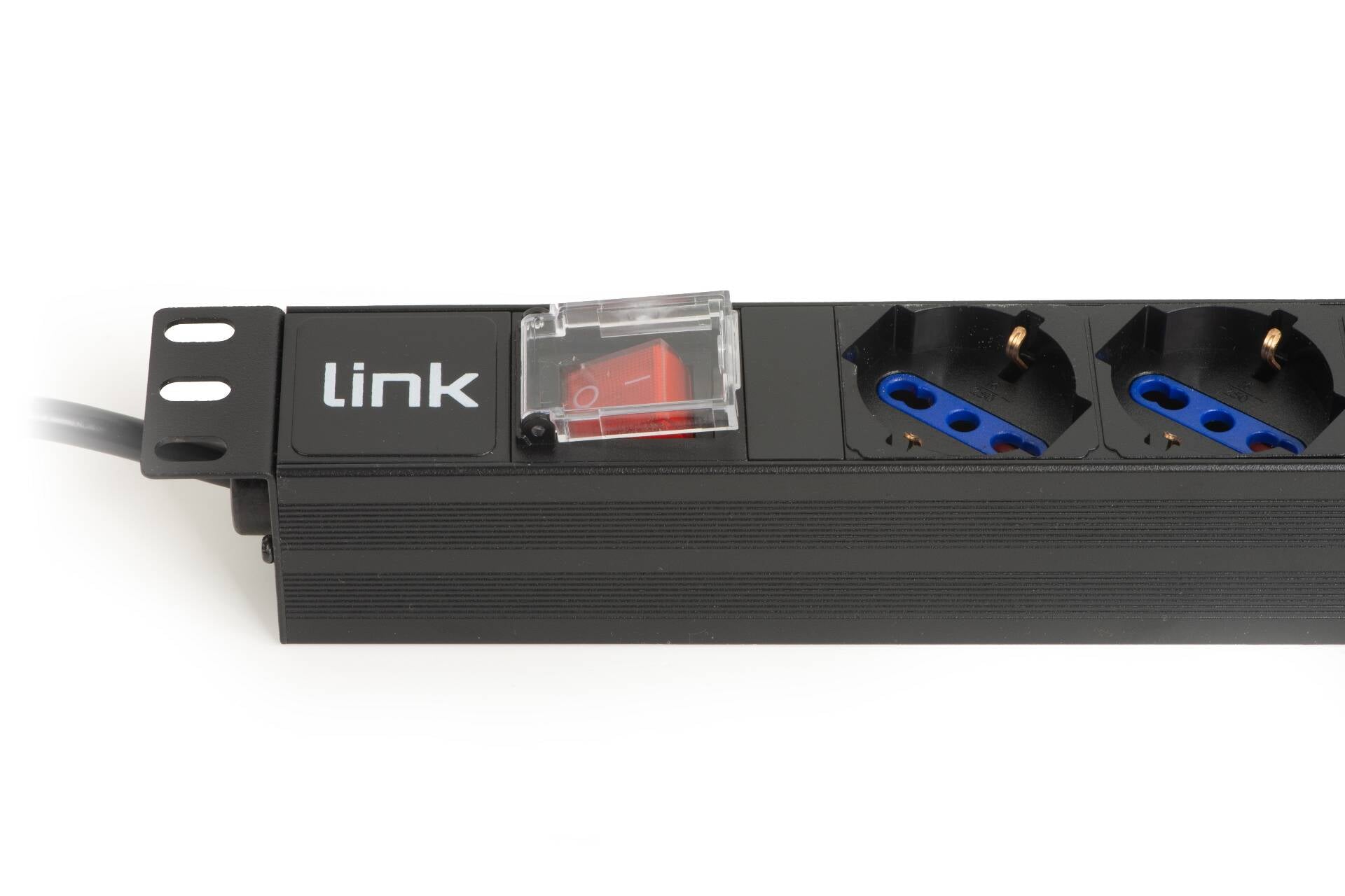 PRESA MULTIPLA PER ARMADI RACK 19'' CON INTERRUTTORE LUMINOSO.Per alimentare i dispositivi all'interno degli armadi rack, si installa sui montanti laterali 19 pollici con le staffe incluse (reversibili).Il particolare coperchio di protezione dell'interruttore apribile e richiudibile con cerniera impedisce lo spegnimento accidentale della multipresa, senza bisogno di rimuovere il coperchietto tutte le volte che si deve accendere e spegnere la multipresa.Con 7 prese universali Schuko tedesche CEE 7/7 e italiane tripolari UNEL 2P+T 16A femmina disposte a 35 gradi e una spina italiana tripolare 16 ampere maschio.La disposizione delle prese a 35° permette il collegamento dei cavi spina tedesca a 90° Specifiche cavo H05VV-F, sezione 1,5 mm Occupa 1 Unità.250Volt 3500Watt.Lunghezza cavo mt.1,75