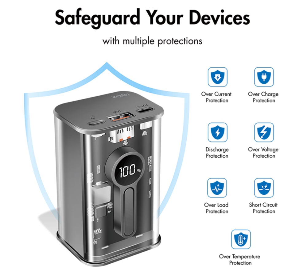 Power Bank 10000 mAh 1x USB-A 1x USB-C con Display PD & QC Trasparente