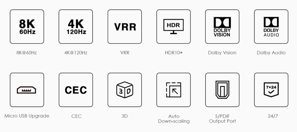 Adottando l ultimo standard HDMI2.1, la trasmissione del segnale video arriva fino a 8K@60Hz/4K@120Hz/1080p@240Hz.