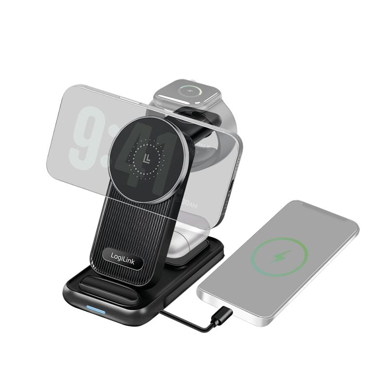 - Uscite: Wireless 1 (telefono): 5 W/7,5 W/10 W/15 W max., Wireless 2 (auricolari): 3,0 W max., Wireless 3 (orologio): 2,5 W max., USB-C cablato: 5 V/1,5 A (7,5 W max.), Wireless 1 + Wireless 2 + Wireless 3: 20,5 W max., Wireless 1 (5,0 W max.) + Wireless 2 + Wireless