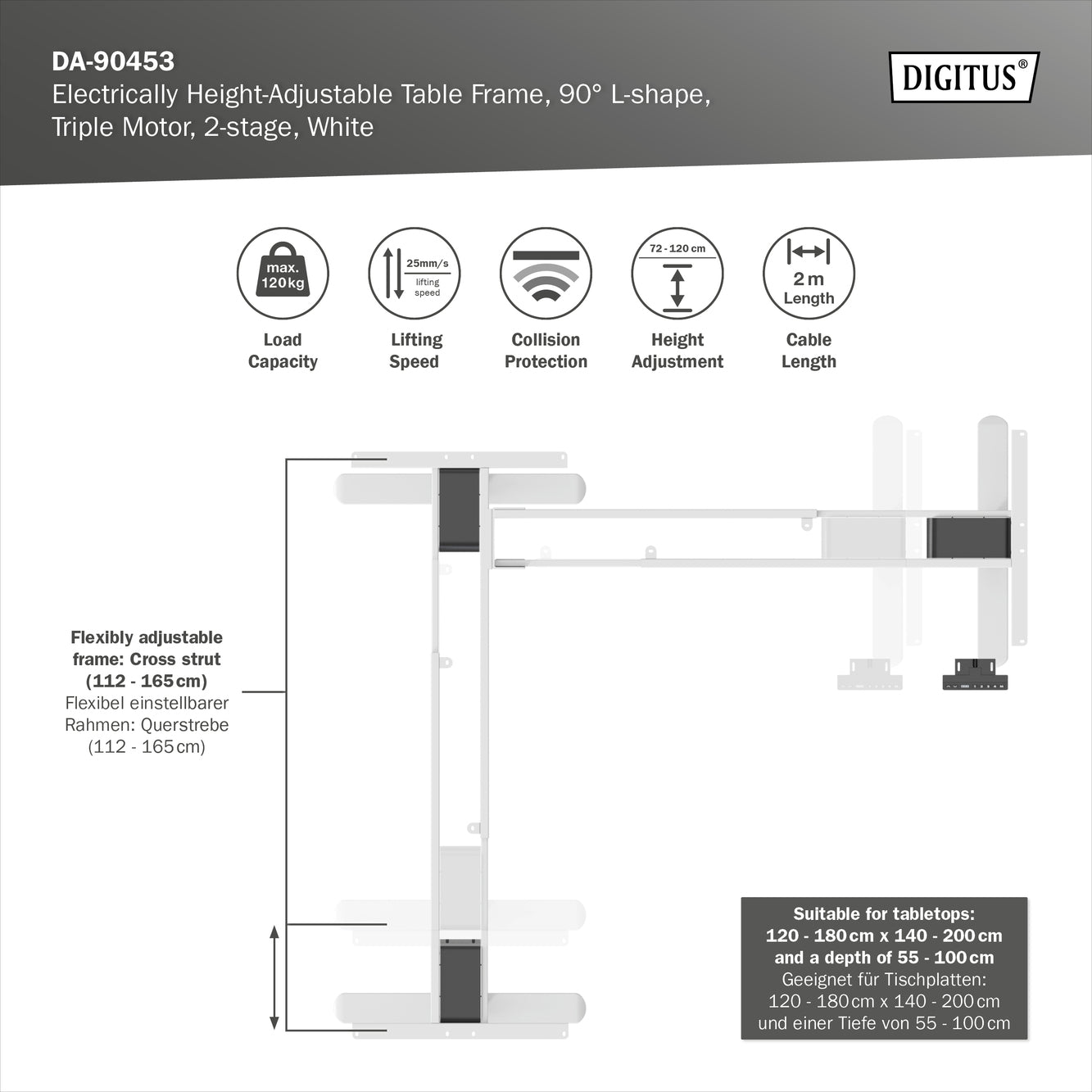 Con la struttura per tavolo regolabile in altezza elettricamente di DIGITUS® è possibile trasformare con facilità la scrivania in una postazione di lavoro ergonomica, dove lavorare da seduti o in piedi.Non perdere tempo e denaro a cercare una scrivania regolabile in altezza; scegli invece il nostro kit integrabile e regolabile elettricamente.Questo modello può essere utilizzato su tavoli di lunghezza 120-180 cm e 140-200 cm.Consigliamo tavoli con una profondità da 55 a 100 cm.Grazie al pannello di controllo integrato è possibile memorizzare 4 diverse altezze di lavoro; per impostarle basta premere un pulsante.Il display a LED mostra l’altezza in uso.La protezione anti-collisione integrata evita che il tavolo urti contro possibili ostacoli mentre viene sollevato o abbassato.Dettagli tecnici Carico massimo fino a 120 kg Telaio regolabile in modo flessibile: Barra trasversale (112 - 165 cm) x barra longitudinale (130 - 180 cm) Adatto per tavoli: 120 - 180 cm x 140 - 200 cm e una profondità di 55 - 100 cm La barra longitudinale (terza gamba) può essere installata a destra o sinistra in modo flessibile Regolabile in altezza elettricamente e comodamente (senza ripiano del tavolo): 72 - 120 cm Elemento di comando per regolare l’altezza con display a LED (3 impostazioni della luminosità) e funzione Memory per 4 impostazioni dell’altezza Funzione di protezione anticollisione (G-Sensor) con 3 livelli di sensibilità - riconoscimento di ostacoli nel movimento in avanti e indietro Sistema di arresto automatico - arresta il motore in caso di resistenza e fa arretrare la struttura 3 motori per la regolazione in altezza facile e silenziosa (<50 dB) - velocità di sollevamento 25 mm/sec. 3 piedi (larghi 58,5 cm), ciascuno dotato di 2 cuscinetti per la regolazione di precisione per compensare le irregolarità del pavimento Peso: 30 kg Forma: Forma a L Colore: Bianco Cavo di collegamento alla rete: Eurospina (tipo C, CEE 7/16) – C7, presa dispositivo, lunghezza: 2 m