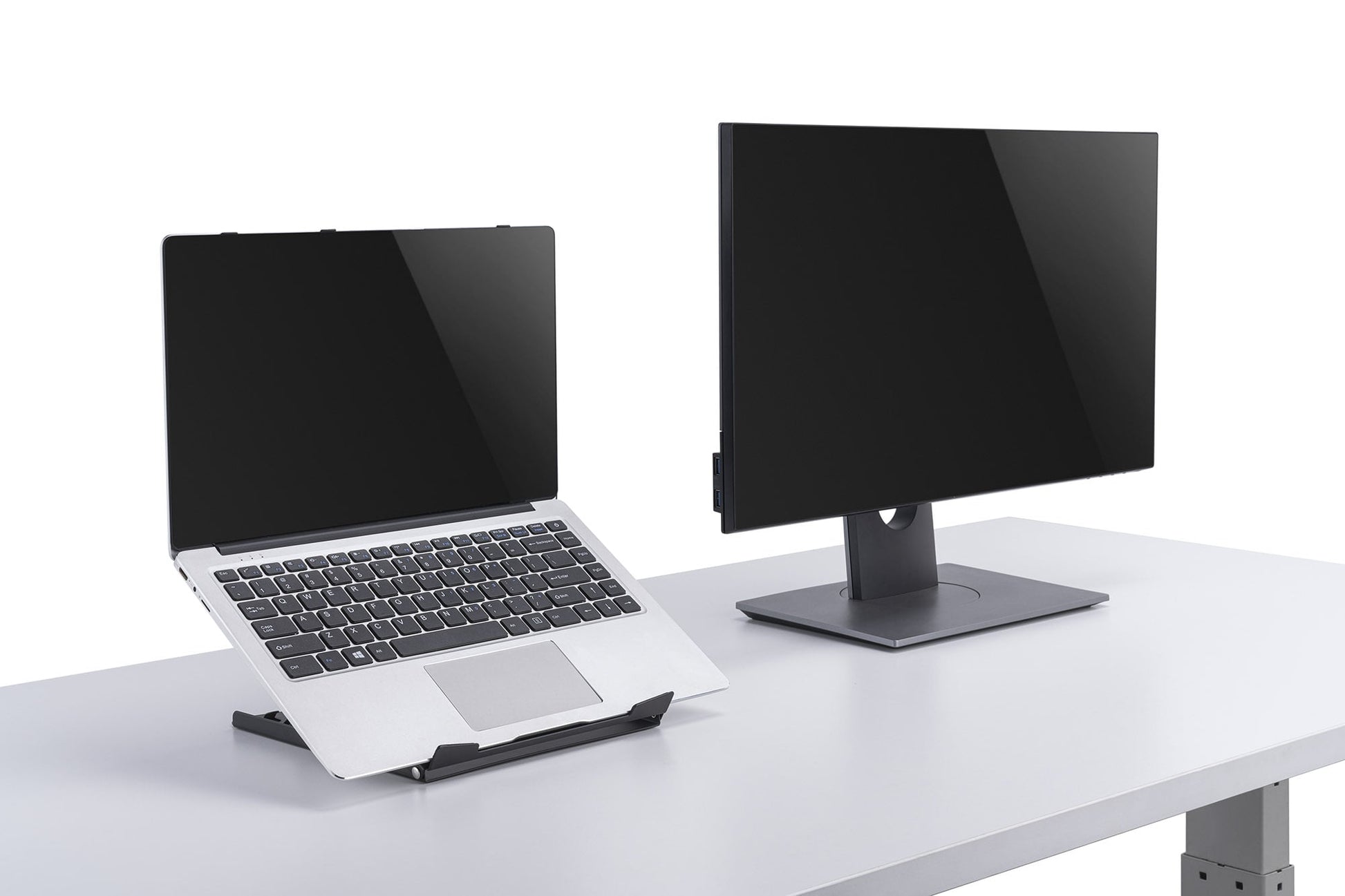 - Pieghevole, si inserisce facilmente in una borsa porta-notebook: consente di creare una posizione di lavoro mobile sollevata ovunque sia necessario come in albergo, negli stand delle fiere e altro ancora