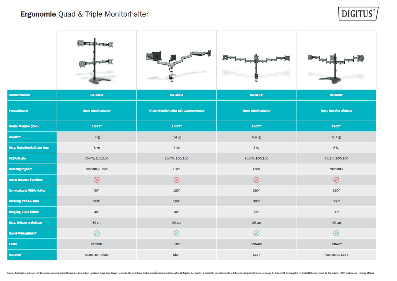 Supporto universale triplo monitor con morsetto fino a 69cm (27'') Digitus Morsetto da tavolo triplo monitor, nero, 90ø girevole, 30ø inclinabile, rotazione 360ø,15''-27'' TFT, Carico max 3 x 8 Kg, VESA max 100 x 100 Supporto universale per monitor per posizionare in modo flessibile lo schermo della postazione di lavoro, regolandone la posizione verticalmente e orizzontalmente e ruotandolo.Regolate lo schermo a un’altezza più comoda per la visione.Il supporto per monitor consente il montaggio di schermi LED o LCD di qualsiasi marca.Ê sufficiente fare attenzione alle dimensioni VESA e al peso dello schermo per scegliere il supporto appropriato.Technical Detais Compatibile con gli standard VESA 75 x 75 e 100 x 100 mm Per ripiani fino a 7,5 cm Per monitor fino a 69cm (27'') Carico massimo 8 Kg per braccio Regolazione separata dell’altezza fino a 15mm per un perfetto allineamento del monitor Angolo di inclinazione verticale regolabile fino a 45 gradi Girevole a 360 gradi Peso: 6,4 kg Dimensioni: 1448 x 550 x 120 mm
