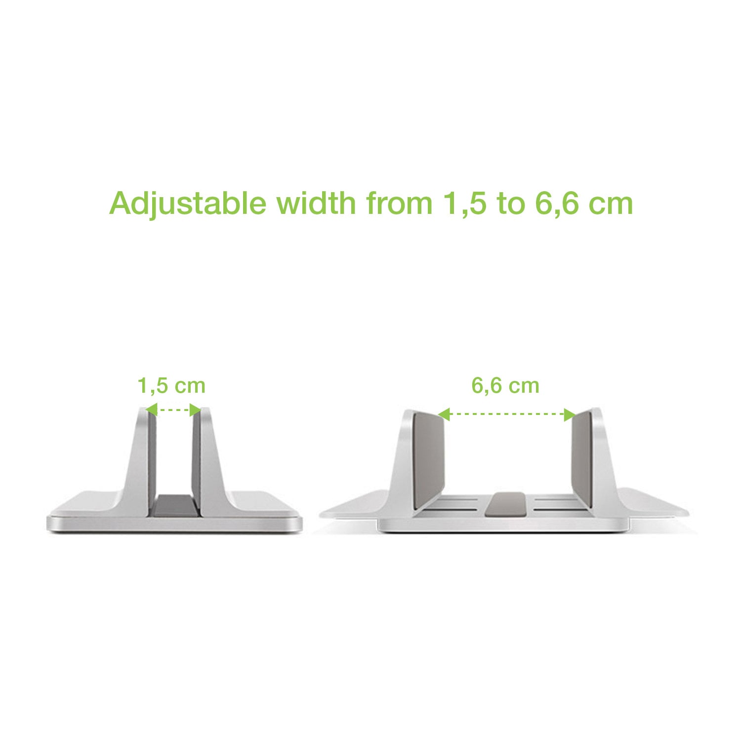 - Larghezza regolabile da 1,5 a 6,6 cm per poter accogliere la maggior parte dei Mac e dei dispositivi in commercio