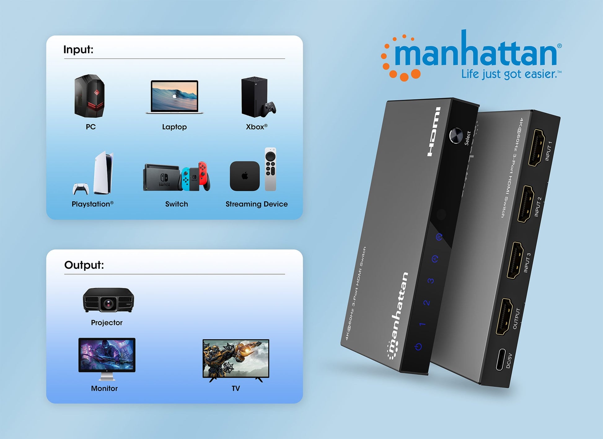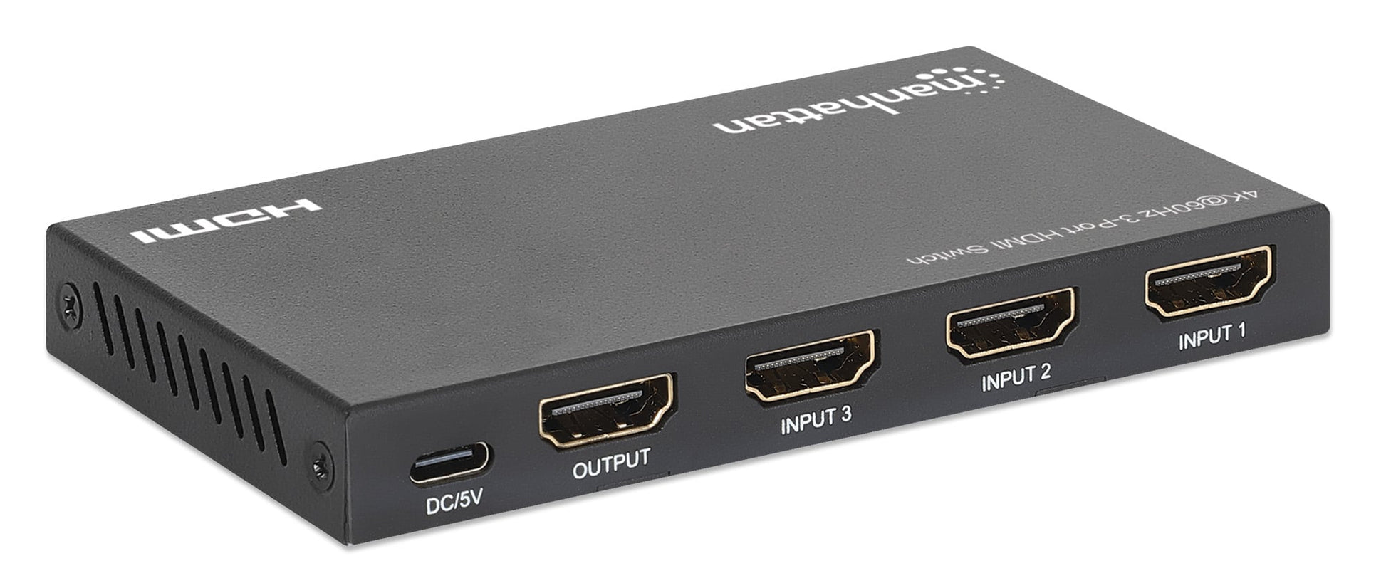 - Commuta tra tre sorgenti audio/video HDMI su un singolo schermo