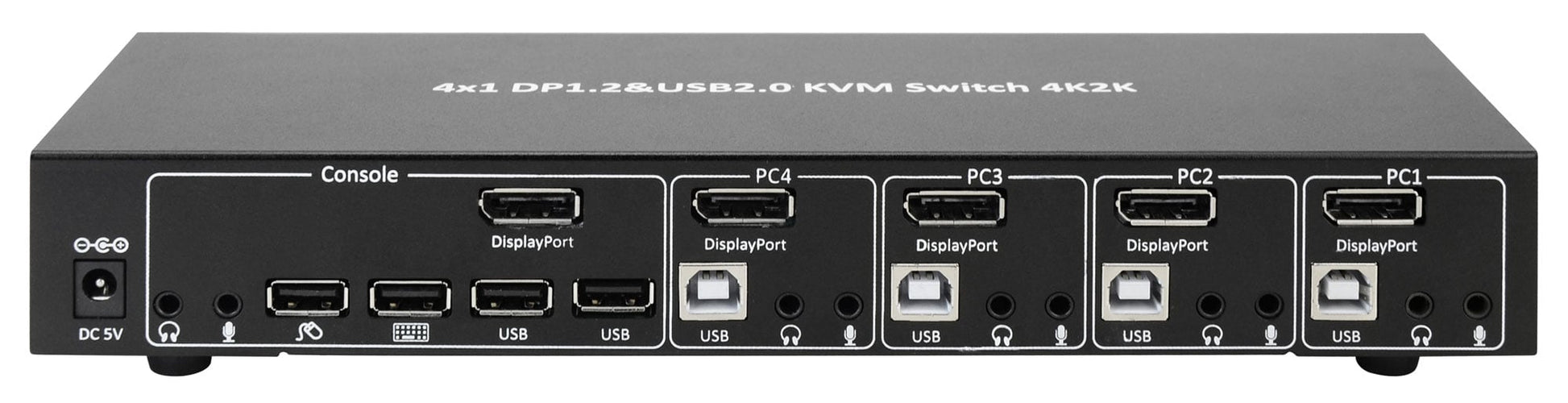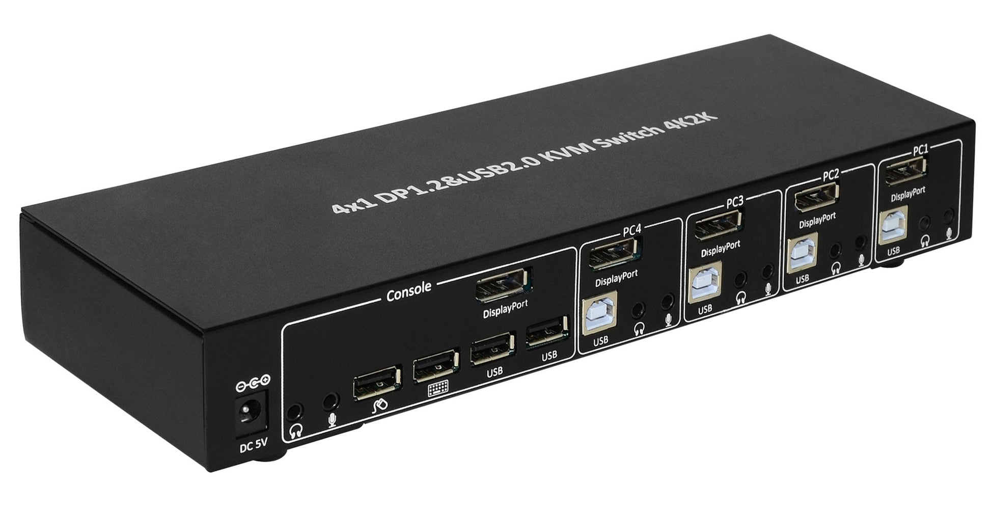 Questo 4x1 DP&USB KVM Switch permette di condividere uno schermo, una tastiera e un mouse USB con audio e microfono tra due computer DP e USB. È provvisto di due porte USB 2.0 extra con rilevamento e protezione da picchi di corrente per connettere due periferiche aggiuntive. Supporta risoluzione video fino a 4096*2160@60Hz con video link rate fino a 21.6Gbps e formati audio Dolby True HD e DTS HD Master Audio. È caratterizzato inoltre da un alloggiamento in metallo per una migliore schermatura contro le interferenze elettromagnetiche e permette all’utente di commutare la periferica utilizzando il tasto frontale di selezione o tramite tasto hotkey. É completamente compatibile con un’ampia gamma di sistemi operativi Windows e Mac.