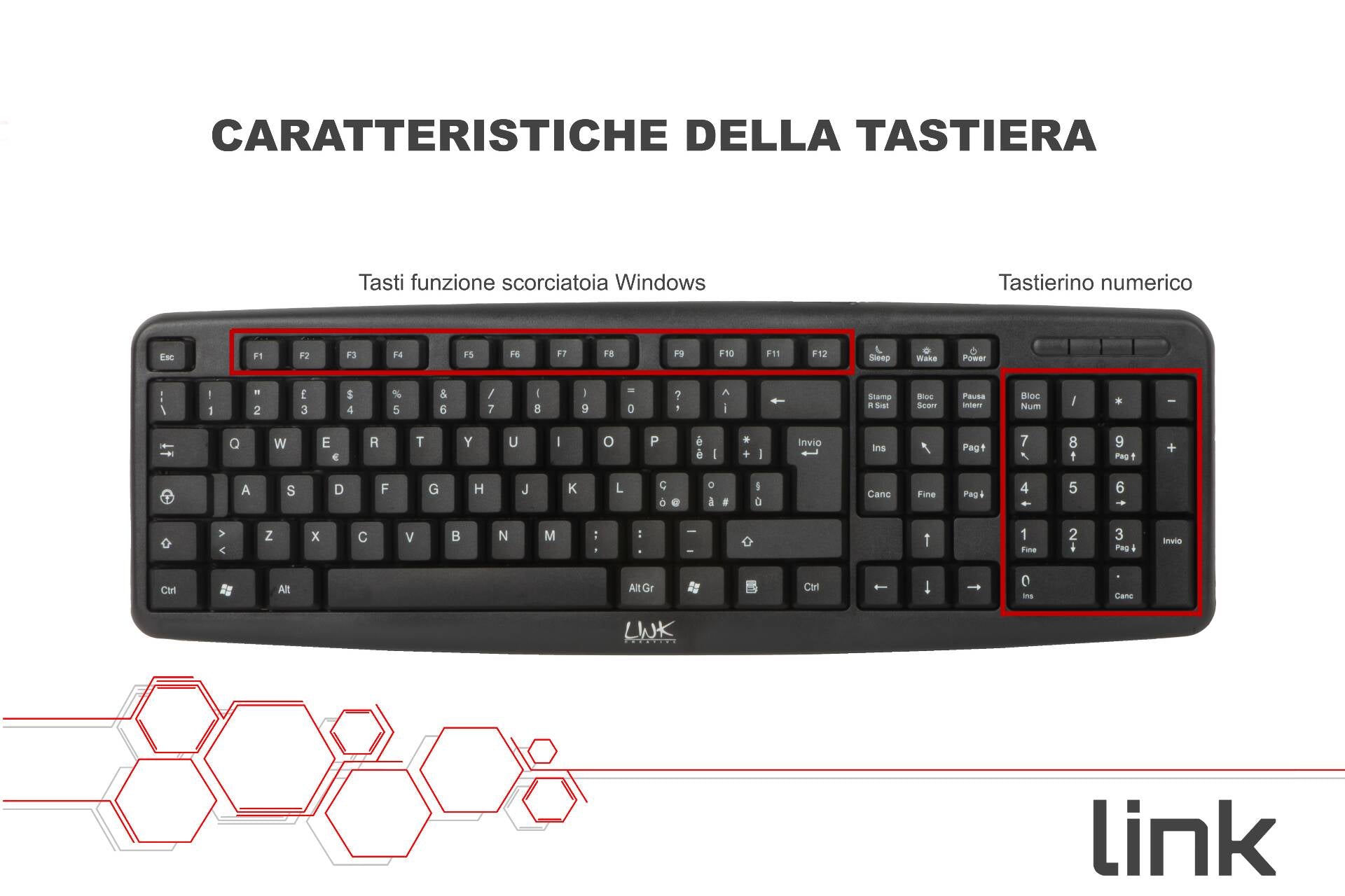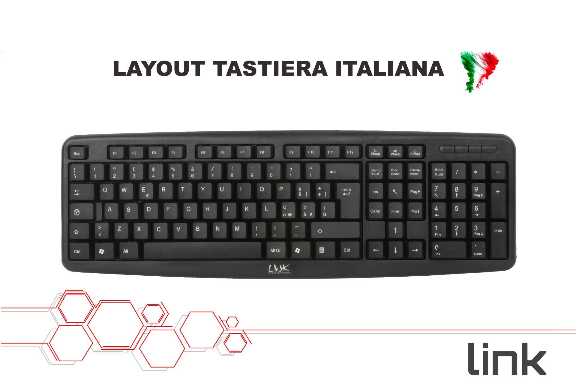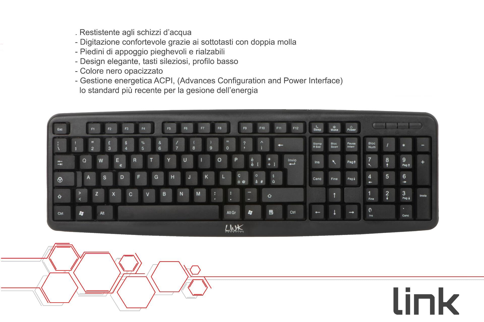 Tastiera con schema tasti italiano, cavo con connettore Minidin 6 poli PS2.Resiste agli schizzi di acqua.Digitazione confortevole grazie ai sottotasti con doppia molla.Piedini di appoggio pieghevoli e rialzabili.Design elegante, tasti silenziosi, profilo basso, tastiera numerica di dimensioni standard.Ê sufficiente collegare la tastiera tramite la porta PS2 a un PC desktop o a un notebook ed è già pronta per l'utilizzo.Colore nero opacizzato.Gestione energetica ACPI, (Advanced Configuration and Power Interface) lo standard più recente per la gestione dell'energia.