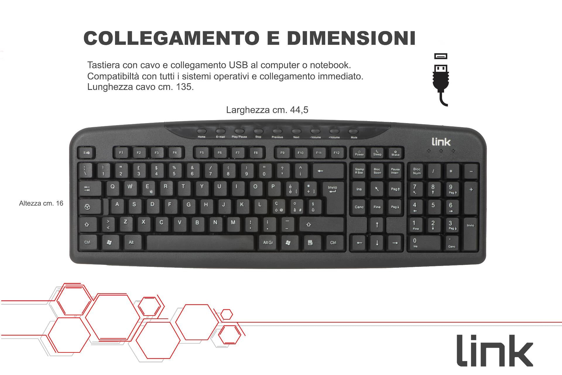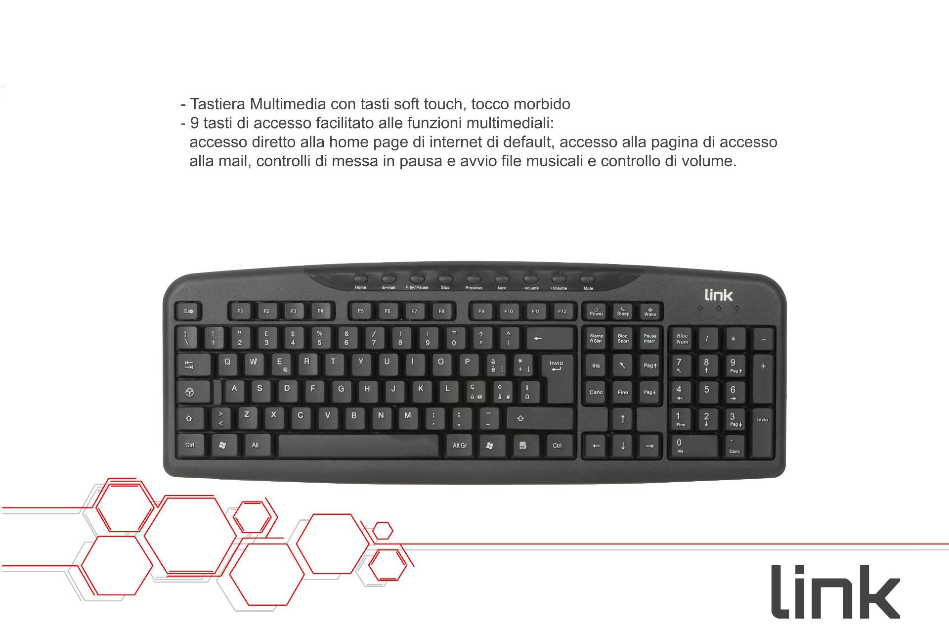 Tastiera Multimedia con tasti soft touch, tocco morbido.Layout standard italiano con 9 tasti per accesso facilitato alle funzioni multimediali: * Home - Premete questo tasto per andare alla home page internet di default * Mail - Premete questo tasto per aprire la pagina delle mail * Play/pause - Premete questo tasto per riprodurre la musica da un CD o un file video (o per ricominciare dopo una pausa)Durante la riproduzione premere questo tasto per fermarlaPremerlo nuovamente per ricominciare la riproduzione dall’ultima interruzione* Stop — Smette la riproduzione dei file multimediali * Previous — Premere questo tasto per ritornare indietro di una traccia durante la riproduzione di un file multimedialeMantenendo premuto il tasto si ritorna indietro velocementePremendolo una volta rapidamente si torna all’inizio della riproduzione correntePremendolo velocemente due volte si torna all’inizio della riproduzione precedente* Next — Premere questo tasto per avanzare di una traccia durante la riproduzione di un file multimedialeDurante la riproduzione di un file, mantenendo premuto il tasto si avanza velocemente lungo quella traccia* -Vol - Premete questo tasto per abbassare il volume * +Vol - Premete questo tasto per alzare il volume * Mute — Premere questo tasto per disattivare il suonoPremerlo di nuovo per riattivare il suonoMisure tastiera 44,5x16 cmLunghezza cavo 135 cm