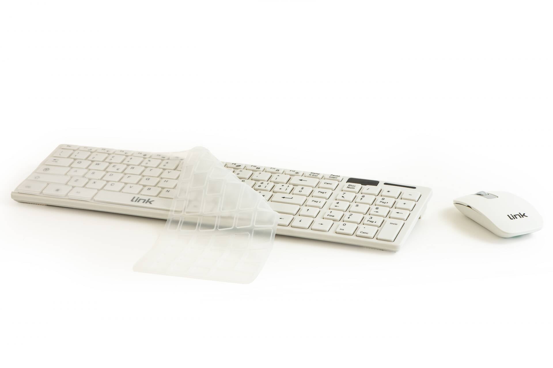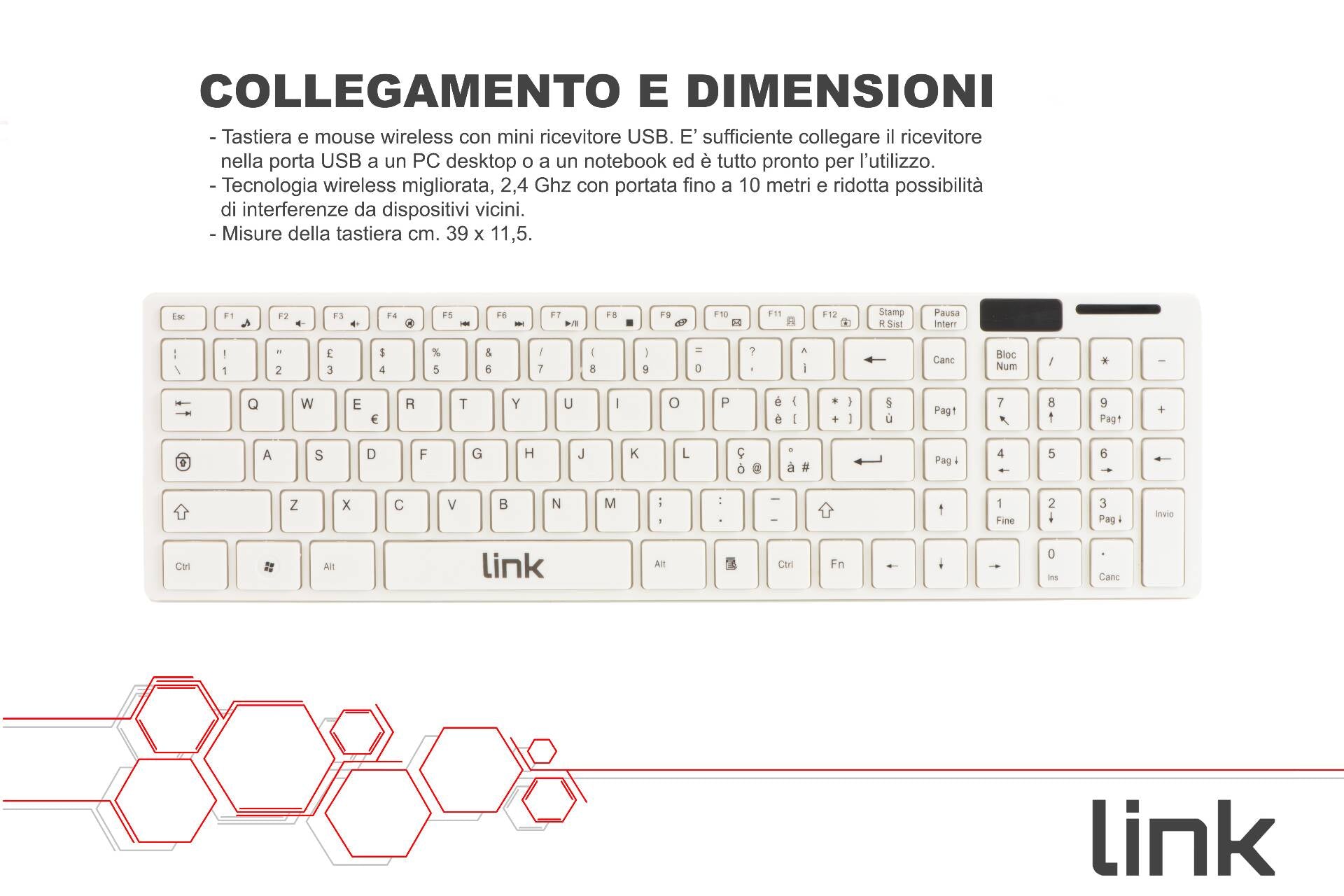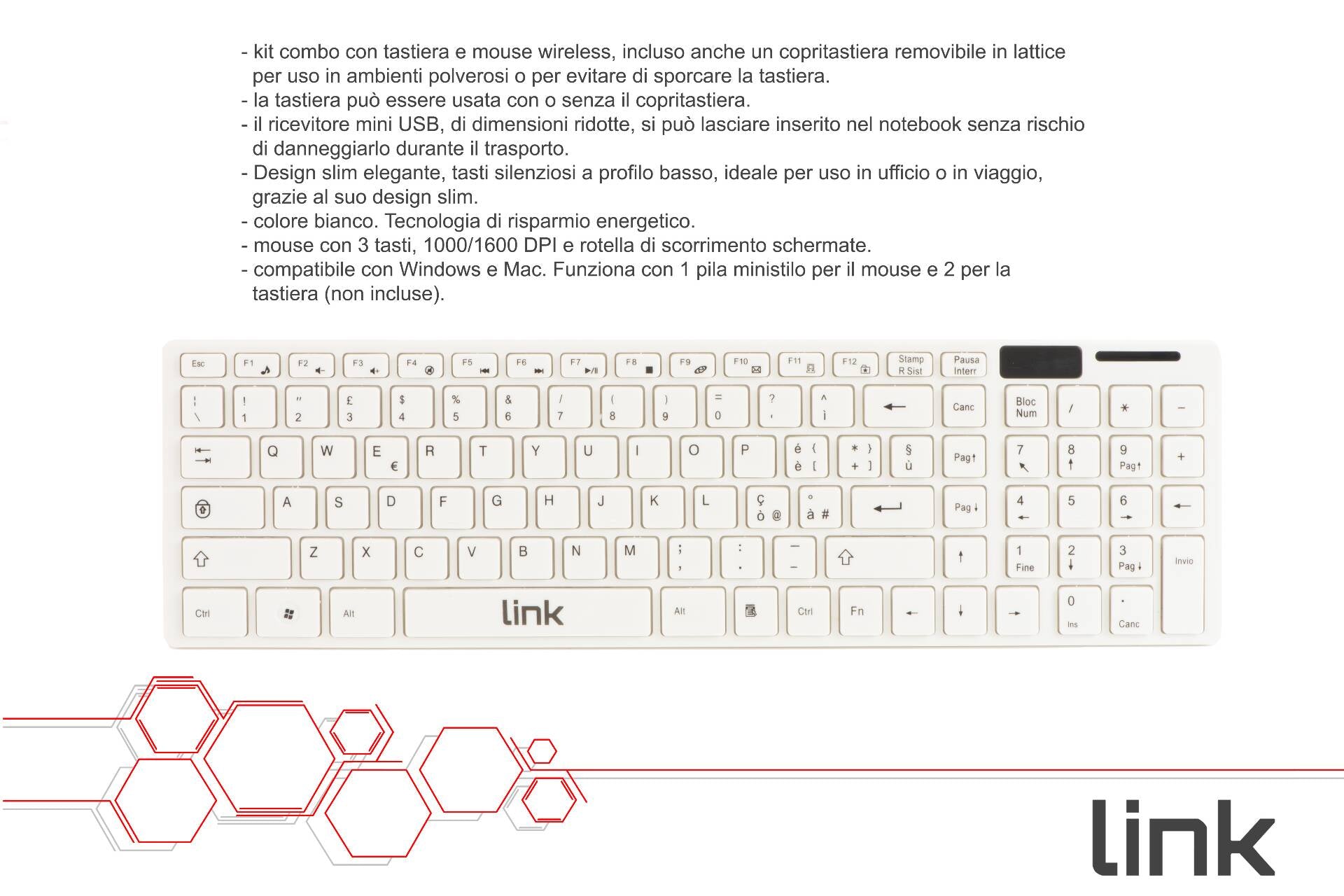 MOUSE E TASTIERA WIRELESS CON COPRITASTIERA Kit combo con Tastiera wireless con schema tasti italiano 104 tasti e mouse wireless, colore bianco, per PC o notebook, è incluso anche un copritastiera removibile in lattice per uso in ambienti polverosi o per evitare di sporcare la tastiera.Si può quindi usare con o senza copritastiera.Mouse e tastiera senza fili, si può quindi utilizzare senza l'impaccio dei cavi. Con ricevitore mini USB, di dimensioni ridotte, si può lasciare inserito nel notebook senza rischio di danneggiarlo durante il trasporto Design slim elegante, tasti silenziosi a profilo basso, tastiera numerica di dimensioni standard, ideale per uso in ufficio o in viaggio, grazie al suo design slim.Ê sufficiente collegare il ricevitore nella porta USB a un PC desktop o a un notebook ed è tutto pronto per l'utilizzo.Colore bianco.Con tecnologia di risparmio energetico.Mouse con 3 tasti, 1000/1600 DPI e rotella di scorrimento schermate.Il ricevitore ha una portata di 10 metri e una frequenza radio 2,4 Ghz.Funzionamento con 1 pila ministilo per il mouse e 2 per la tastiera (non incluse). Tecnologia wireless migliorata, 2.4 GHz con portata fino a 10 metri e meno possibilità di interferenze da dispositivi vicini. Compatibile con Windows e Mac Misure tastiera 39x11,5 cm La confezione include 1 Tastiera slim 1 Mini mouse ottico 1 Mini ricevitore USB