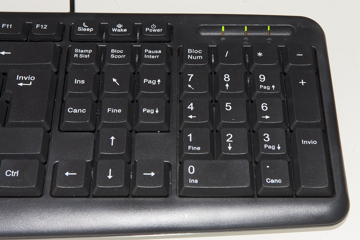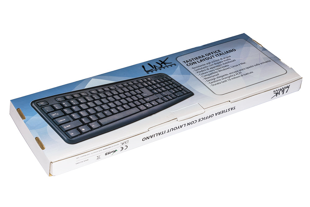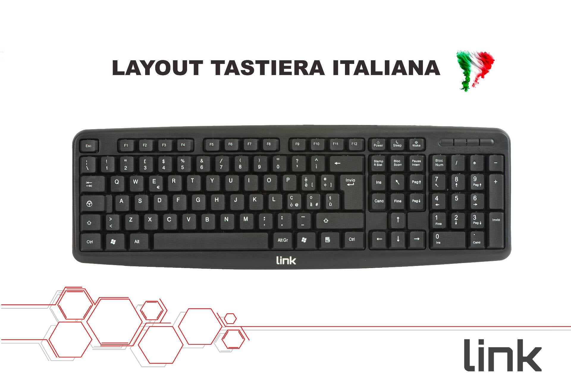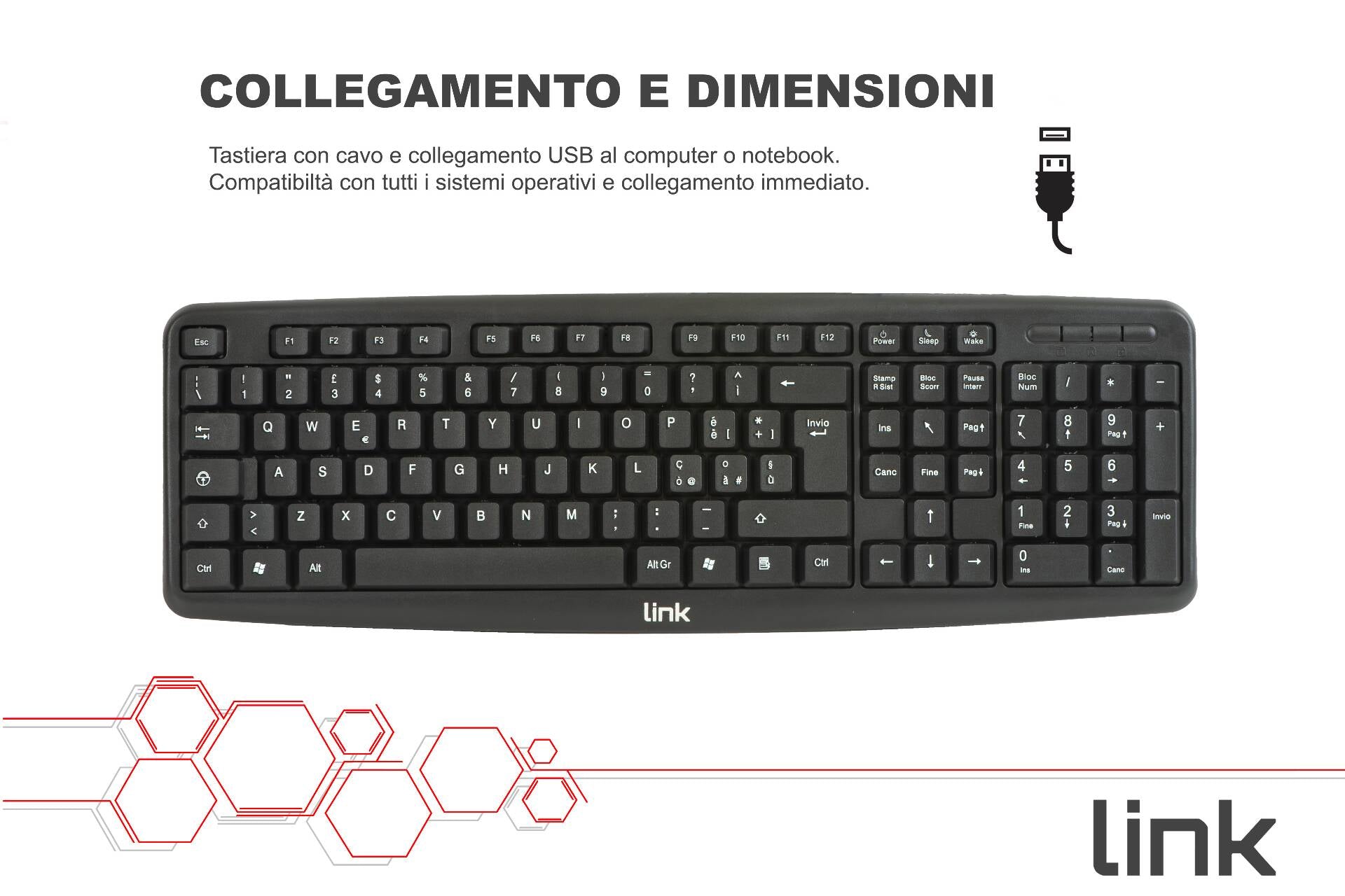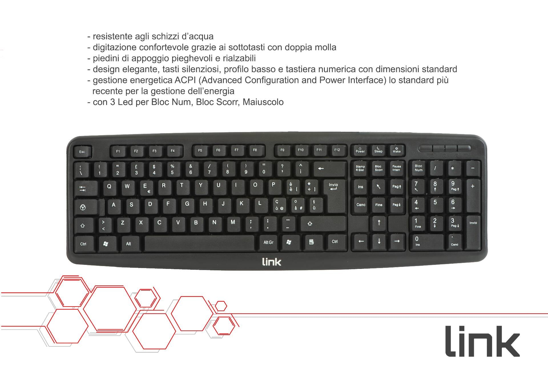 Tastiera con schema tasti italiano, cavo con connettore USB.Resiste agli schizzi di acqua.Digitazione confortevole grazie ai sottotasti con doppia molla.Piedini di appoggio pieghevoli e rialzabili.Design elegante, tasti silenziosi, profilo basso, tastiera numerica di dimensioni standard.Ê sufficiente collegare la tastiera tramite la porta USB a un PC desktop o a un notebook ed è già pronta per l'utilizzo.Colore nero opacizzato.Gestione energetica ACPI, (Advanced Configuration and Power Interface) lo standard più recente per la gestione dell'energia.Con 3 Led per Bloc Num, Bloc Scorr, Maiuscolo.