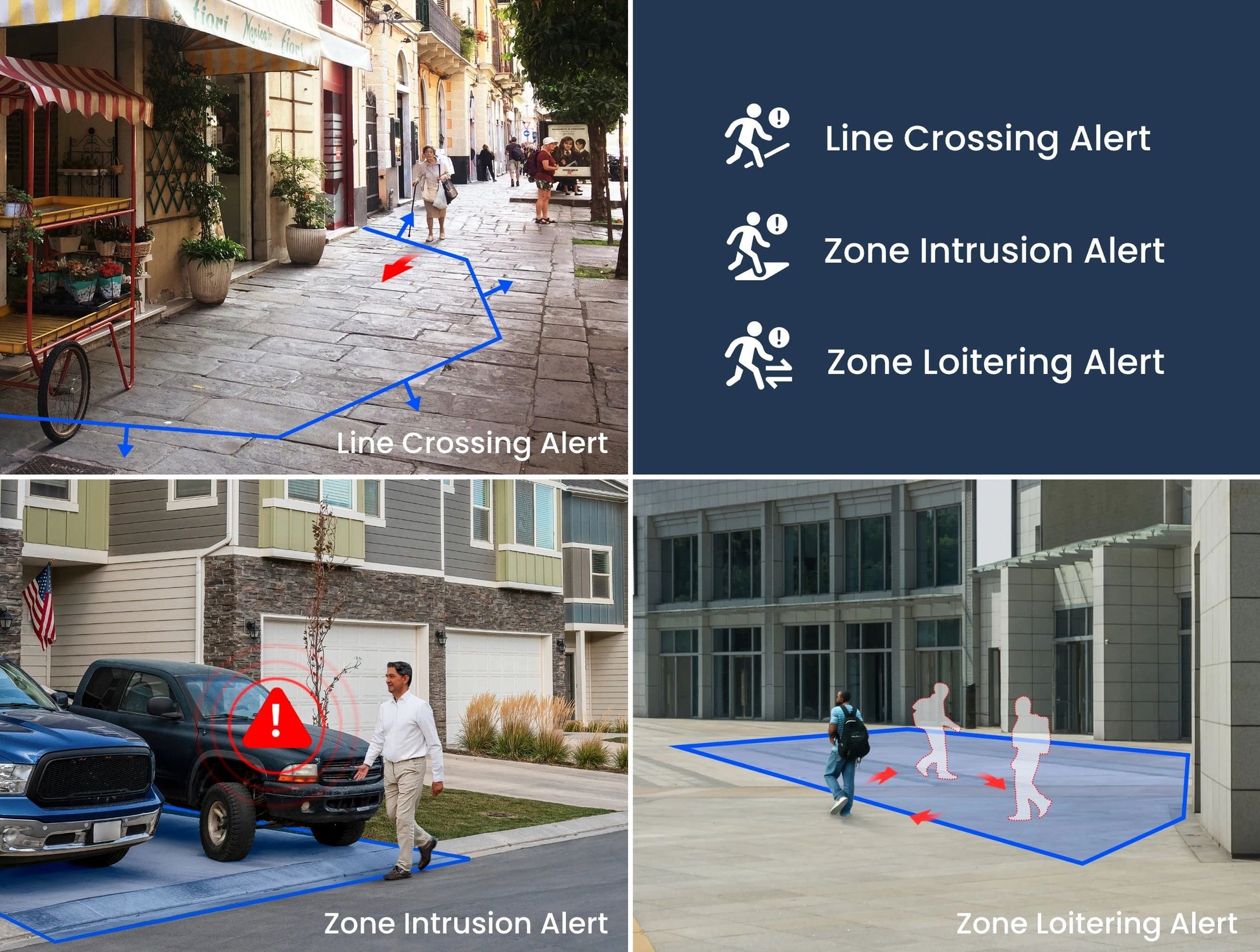 - Protezione perimetrale: dotata di avvisi di attraversamento linea, avvisi di intrusione in zona e avvisi di permanenza in zona basati sull intelligenza artificiale, questa telecamera di livello professionale offre una protezione precisa 24 ore su 24, 7 giorni su 7 per le aree critiche, consentendo una risposta rapida alle minacce alla sicurezza