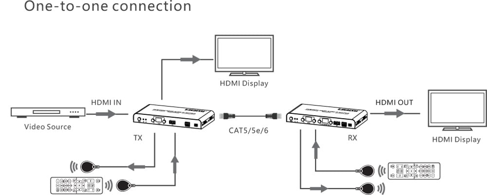 - Il segnale HDMI può essere esteso fino a 120 metri su cavi di rete di categoria 6 o di livello superiore, supportando al contempo la connessione uno-a-uno e la connessione multi-punto