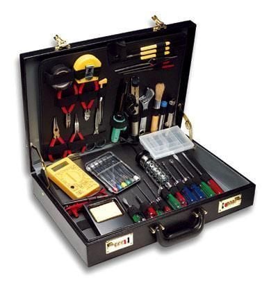 Valigetta professionale contenente 46 pezzi, tra i quali: Tronchesina da 5" con lama inclinata Pinze con becchi da 5" Pinze con becchi piatti da 4.5" Pinze con becchi curvi da 4.5" Cacciaviti di precisione 6 pezzi Cacciaviti colorati: Phillips: 3x75, 5x75, 6x100, 6x38 mm Piatto:3x75, 5x75, 6x100, 6x38 mm Esagonale: 5 mm, 6 mm Pinzette 6" Taglierina multifunzione Chiave a brugola pieghevole 7pz Pennello Nastro isolante in PVC Forbici in acciaio 6" 2 lime (Rotonda & piatta) Pinze regolabili da 6" Kit di saldatura 3pz. Metro a rotolo da 3 m/10 ft Supporto per stagnatore Stagno Pompetta aspira-stagno Saldatore 30 W Multimetro digitale Valigetta porta attrezzi con divisori interni porta-attrezzi removibili