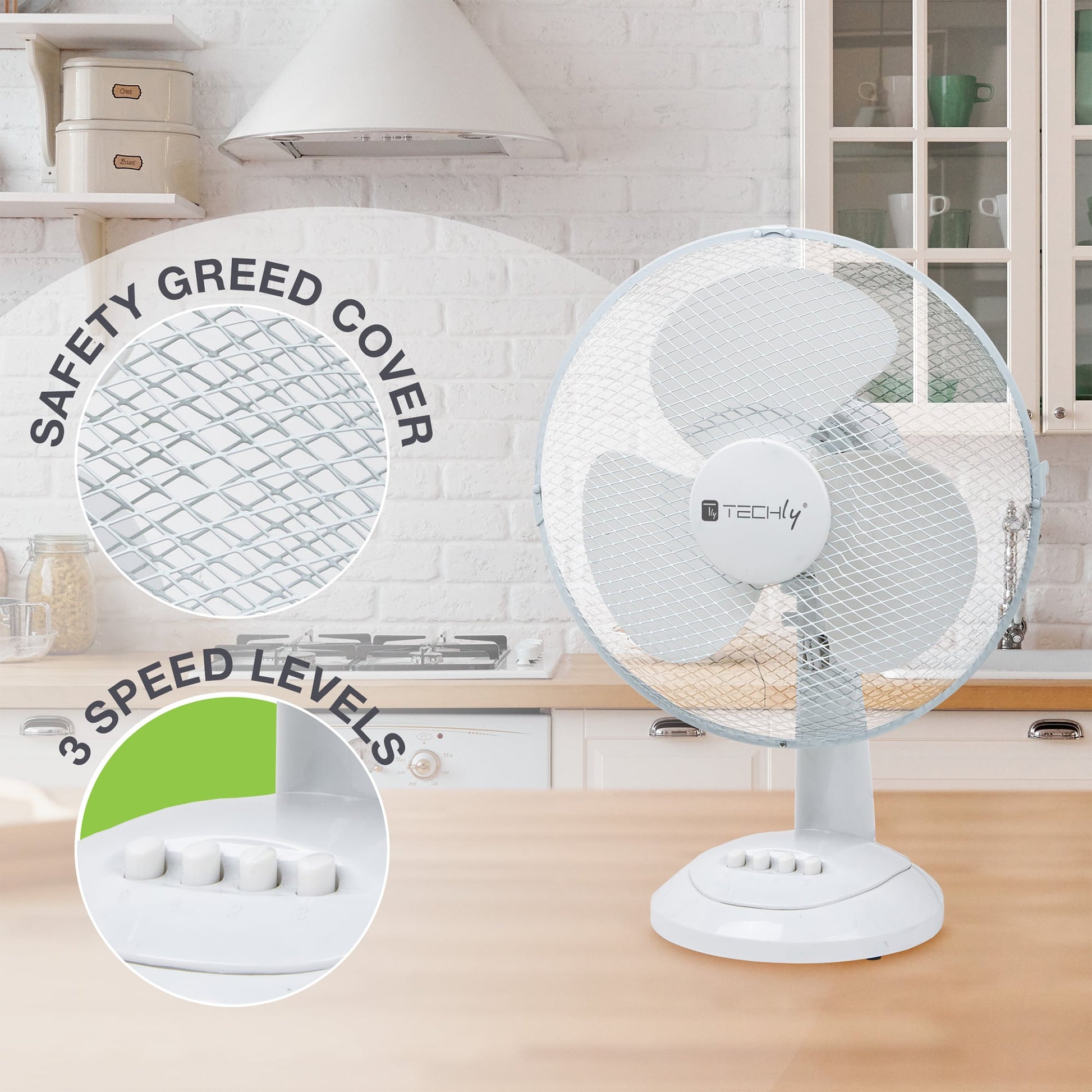 Ventilatore da tavolo con elica a tre pale, dotato di tre velocità di regolazione, oscillazione laterale automatica e inclinazione verticale regolabile.